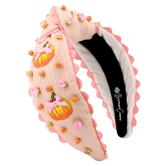- Cross-stitch headband with embroidered pumpkins, pink bows, hand-sewn crystals and beads, and pink ric-rac trim