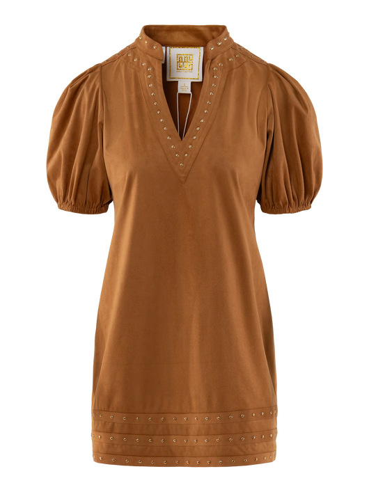 The Hampton Mini in Brown Sugar Suede is a standout take on one of our most beloved silhouettes. Designed with a mandarin collar, V-neckline, and puff sleeves, this dress balances structure with ease. Crafted in plush brown sugar suede, the fabric’s rich texture makes it an ideal choice for the season. Gold studded details trace the neckline and continue across the hemline, giving this classic style a refreshed, modern edge. The mini length adds versatility, making it perfect to wear on its own or layered with boots and outerwear as the weather shifts.