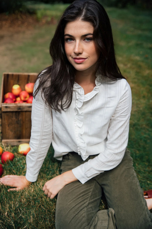 A fresh take on the classic women's oxford--this ruffle front shirt adds a festive flair to any ensemble.