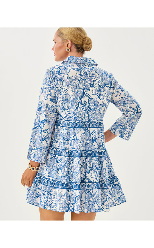 • Swing fit, tiered shirtdress with a collar, functional buttons, 3/4 length sleeves, and side seam pockets.
