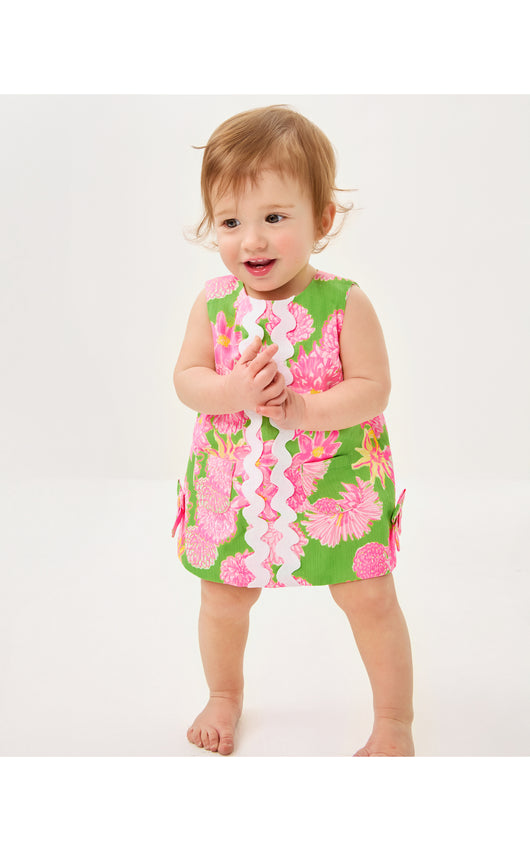 Classic infant shift dress with trim details, a button back closure, and patch pockets. This style also features lining, hem bows, and matching bloomers.