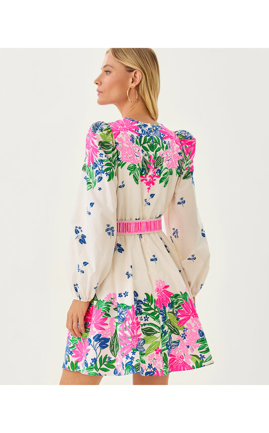 - Fit-and-flare, v-neck dress with long sleeves, a full skirt, separate belt, and side seam pockets.