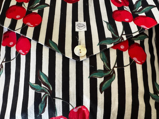 Introducing Cherry Bomb - Black and White! These pajamas are both stylish and comfortable, made with 100% cotton block printed fabric. The playful cherry print will add a touch of fun to your night routine, while the long sleeves and pants will keep you cozy. Sleep in comfort and style with Cherry Bomb.