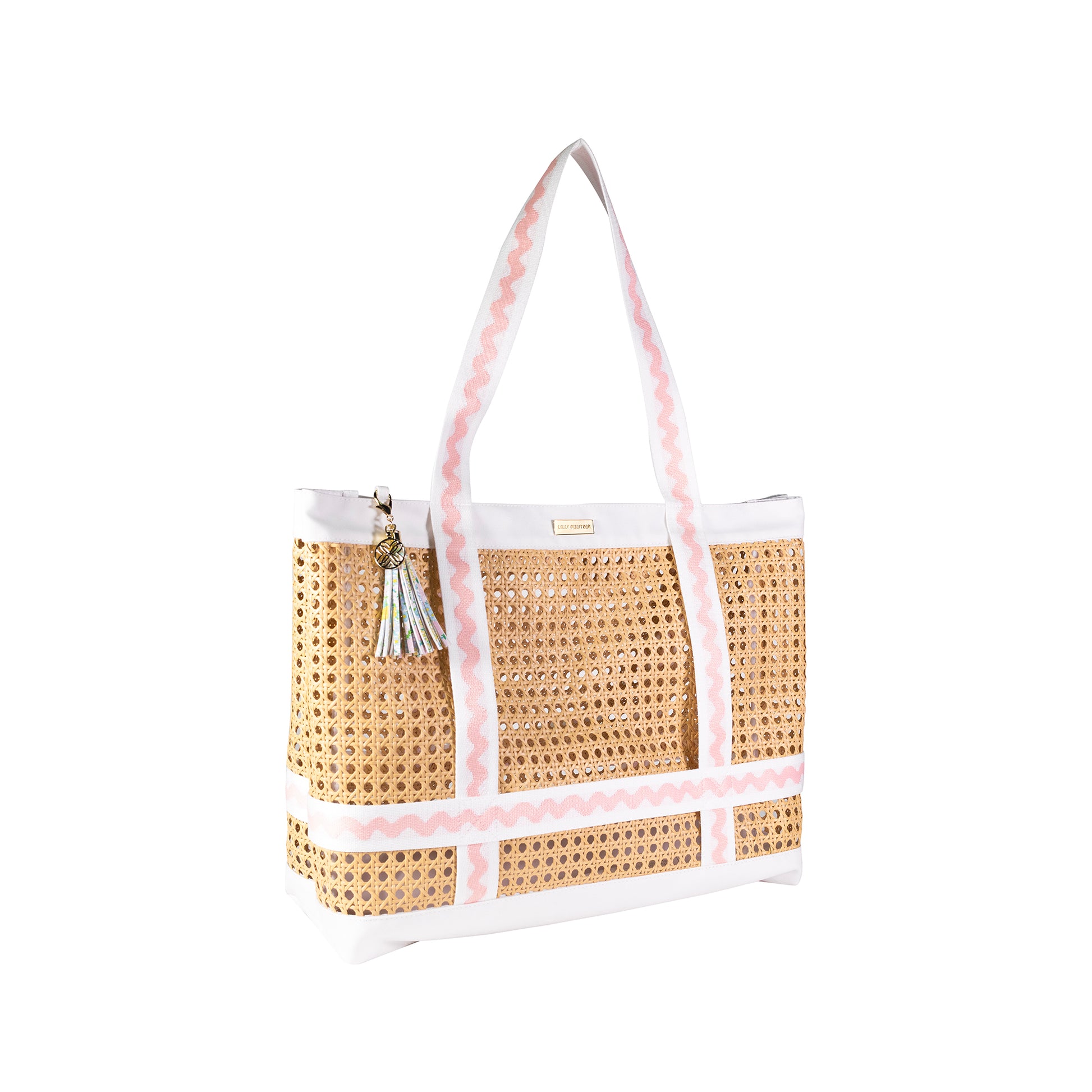 This beach hat tote is begging for a day by the ocean with its woven straps and Lilly Garden Home printed leatherette tassel keychain. This woven caning tote will comfortably hold even the floppiest hat up to 17.25" inches alongside sunscreen, snacks, and all of the other sunny day essentials.
