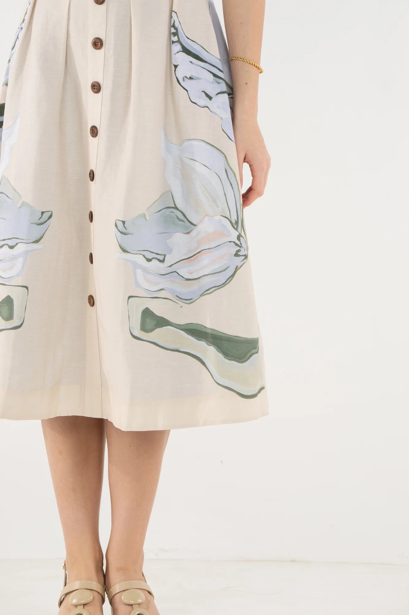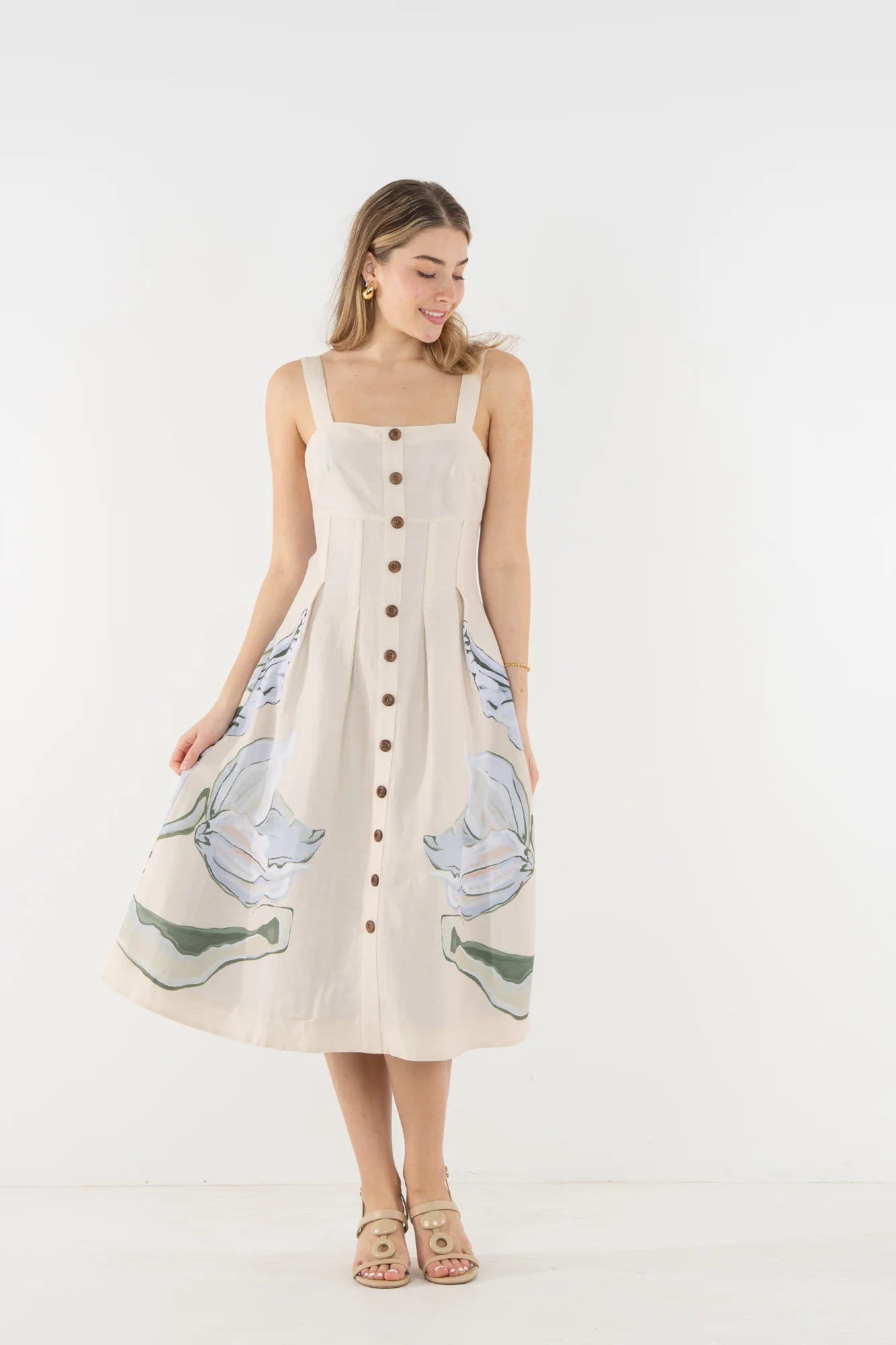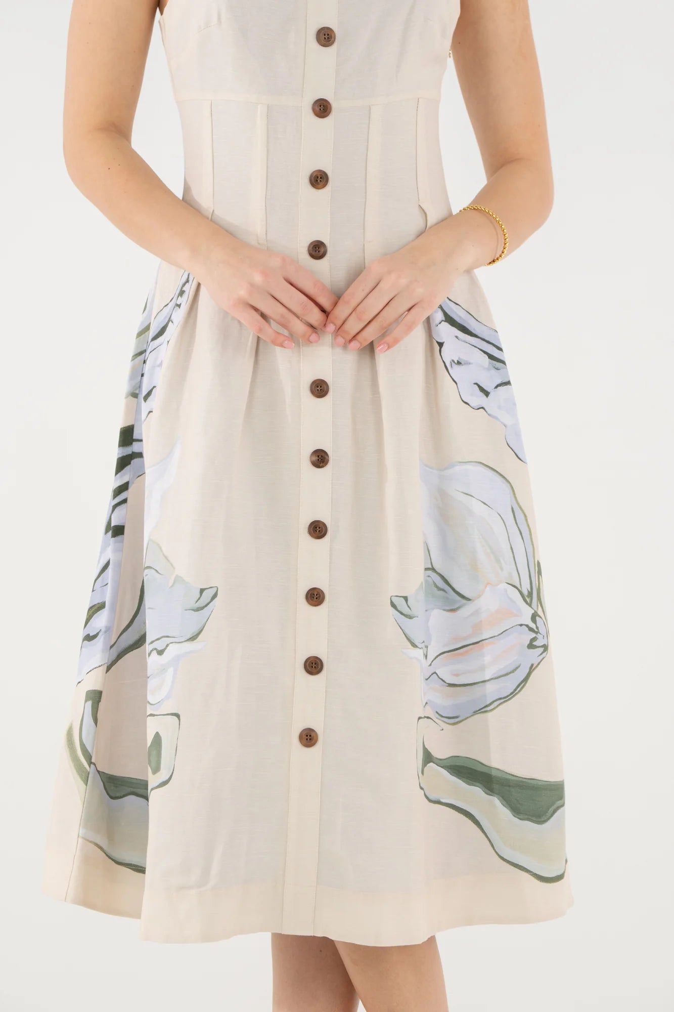 The Constance Midi features adjustable shoulder straps, a lightly boned bodice, and a tailored silhouette designed to flatter and define. Non-functional wooden buttons run along the front, while a hidden side zip closure ensures a smooth finish. Delicate pin tuck pleats add dimension and subtle structure throughout the design. Created in collaboration with artist Jessica O’Neill, the Lavender Fields placed print translates a hand-painted canvas into a wearable work of art, bringing softness and thoughtful detail to this midi silhouette.