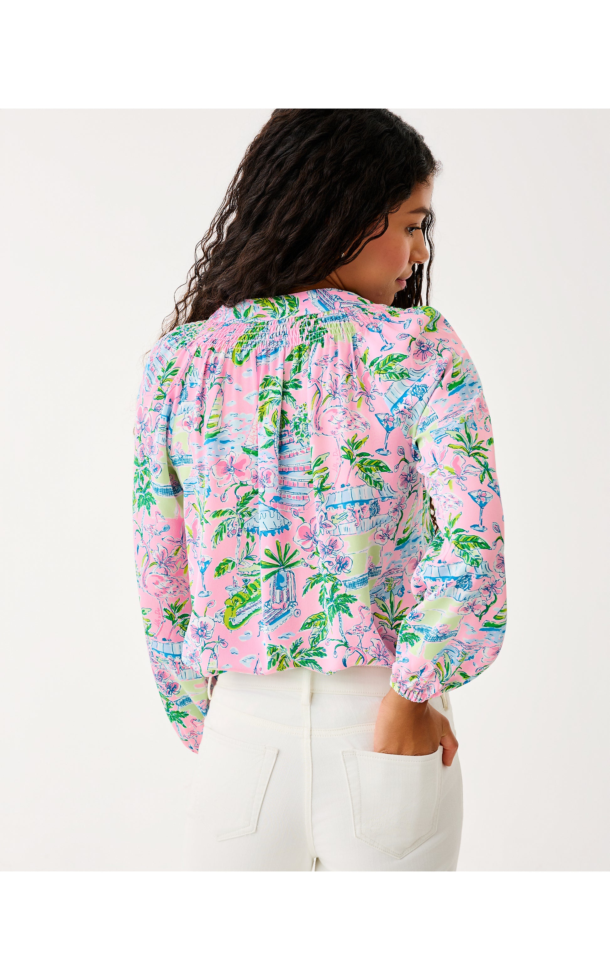 - Easy fit, pullover blouse with gold buttons and bracelet-length sleeves.