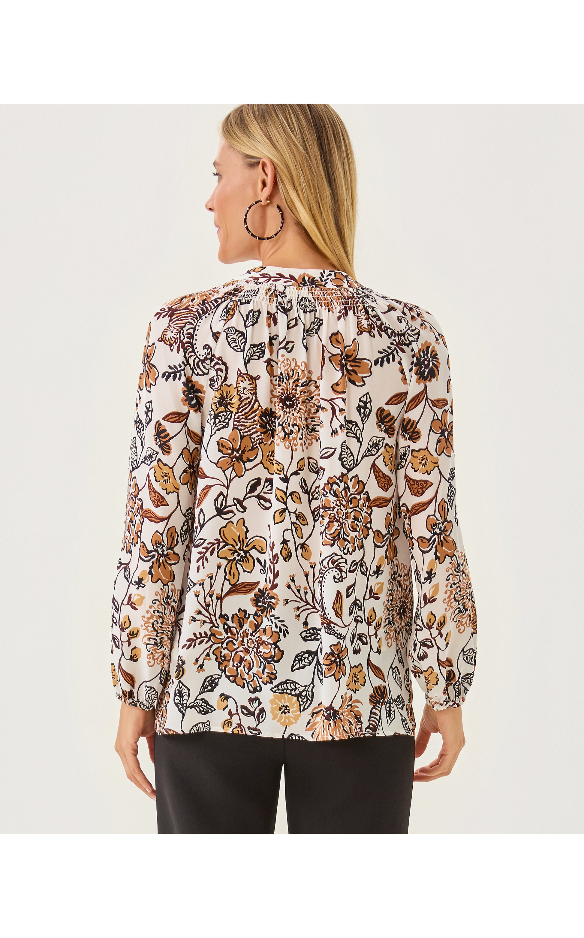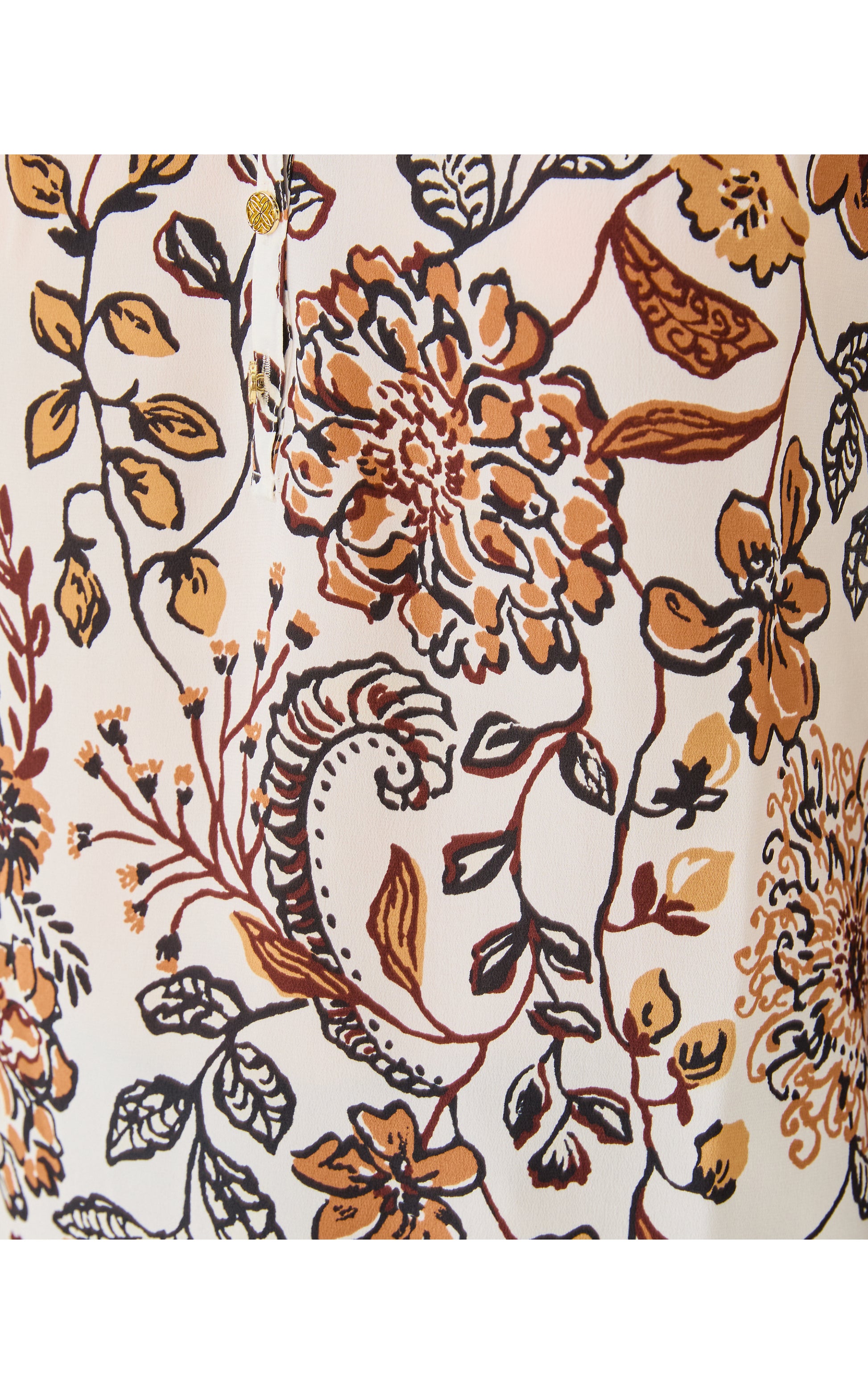 - Easy fit, pullover blouse with gold buttons and bracelet-length sleeves.