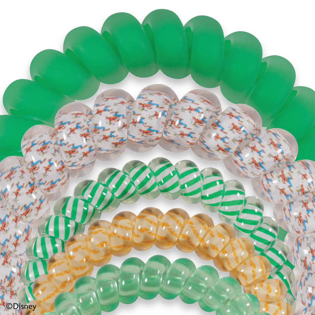 Hold your hair in place with ease and style! Disney | TELETIES Goofy Mix Pack Hair Ties in Green, Yellow, and White offer a strong grip without damage, doubling as a stylish bracelet when not in use. Your new favorite hair essentials all year round.