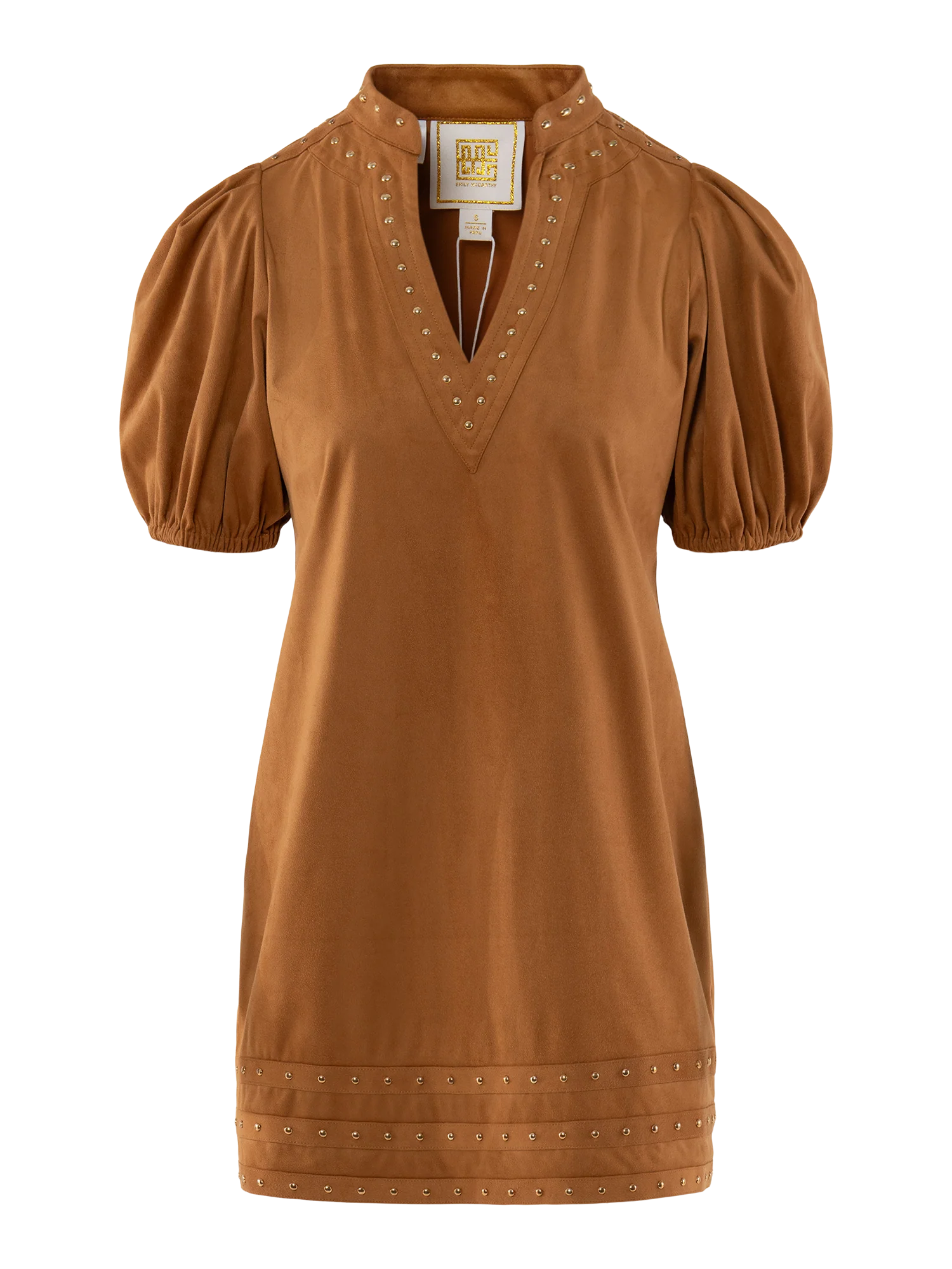 The Hampton Mini in Brown Sugar Suede is a standout take on one of our most beloved silhouettes. Designed with a mandarin collar, V-neckline, and puff sleeves, this dress balances structure with ease. Crafted in plush brown sugar suede, the fabric’s rich texture makes it an ideal choice for the season. Gold studded details trace the neckline and continue across the hemline, giving this classic style a refreshed, modern edge. The mini length adds versatility, making it perfect to wear on its own or layered with boots and outerwear as the weather shifts.