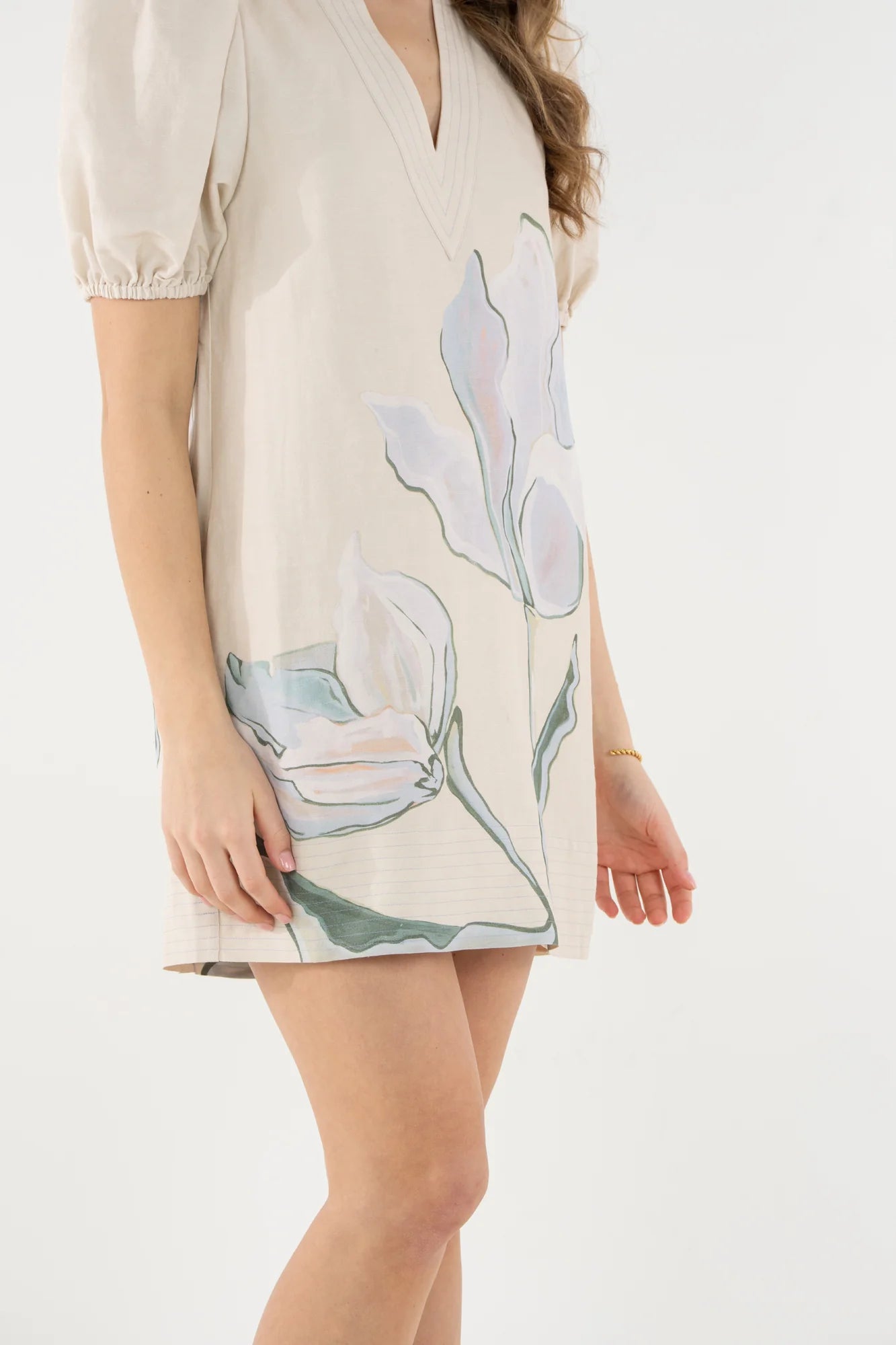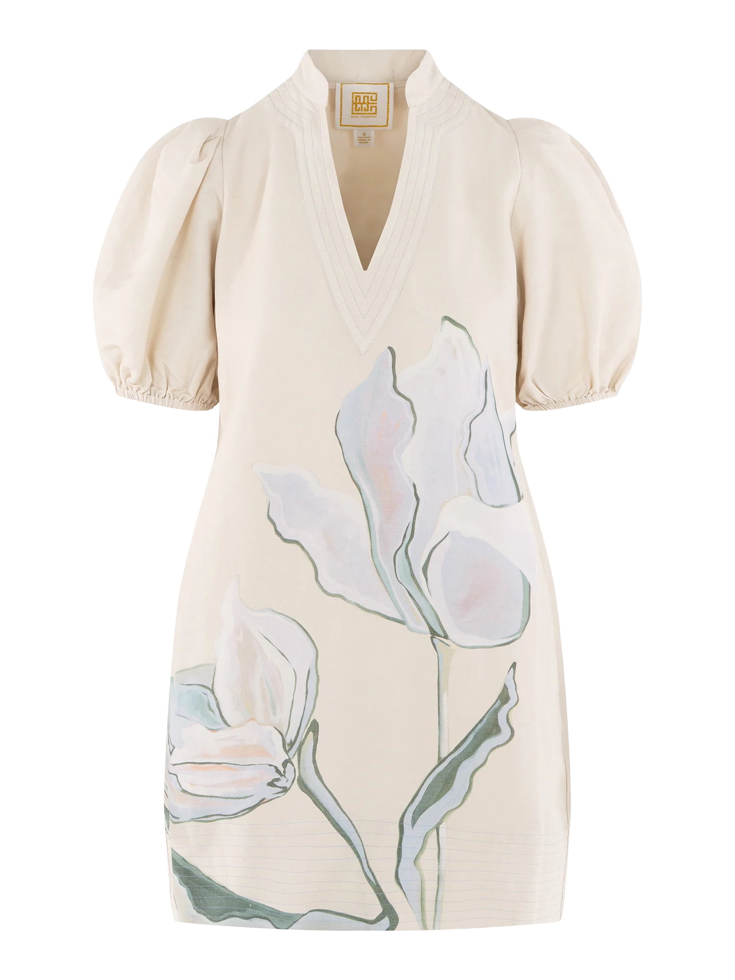 The Hampton Mini in Lavender Fields features a mandarin-style collar, elastic puff sleeves, and functional side pockets, finished with a softly tailored silhouette that offers shape without clinging. Designed in collaboration with artist Jessica O’Neill, the Lavender Fields print translates a hand-painted canvas of gentle florals into a wearable design, bringing a sense of softness and artistry to this signature mini silhouette.