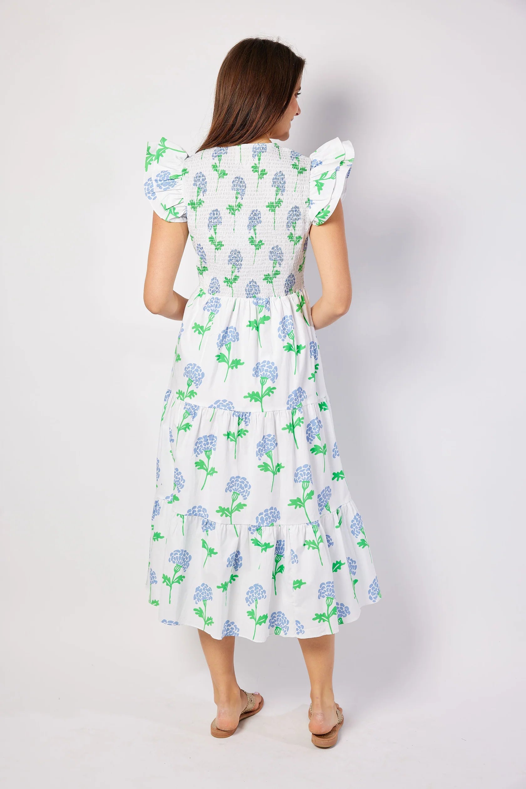 Hydrangea Block Print V-Neck Smocked Midi Dress