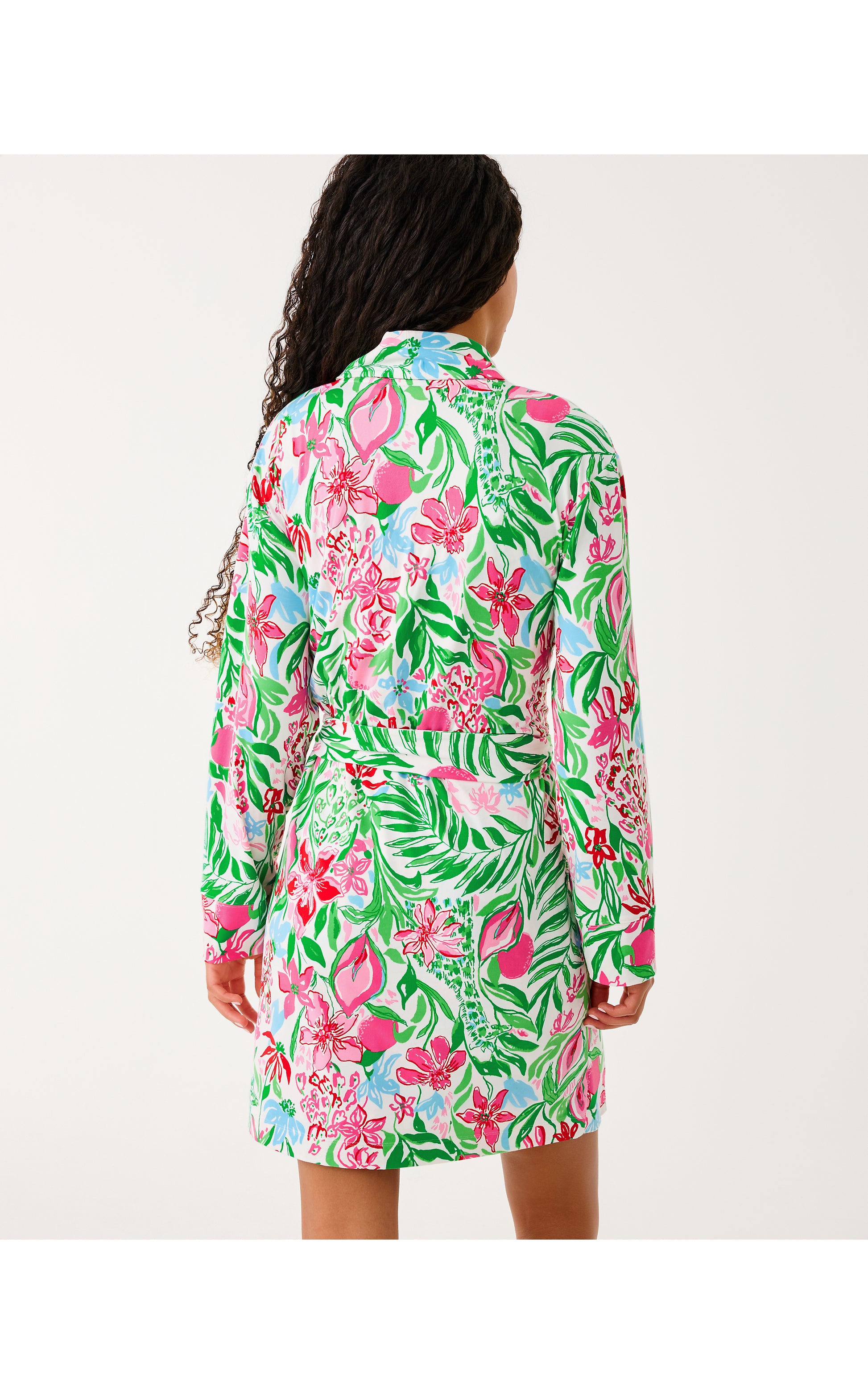 - Relaxed fit pajama robe with long sleeves, a shawl collar, sash, and side seam pockets.