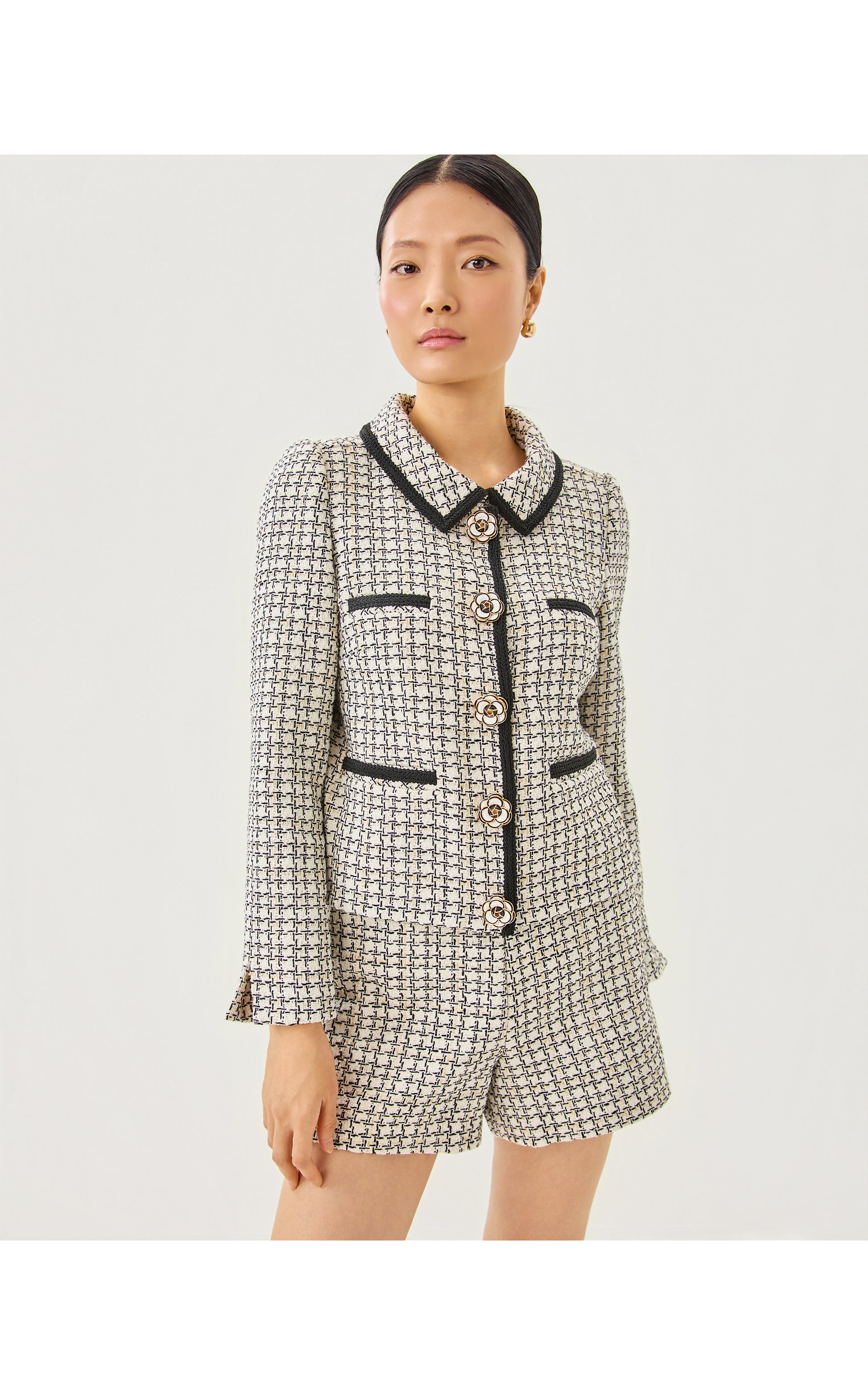 - Straight fit, button front, boucle jacket.