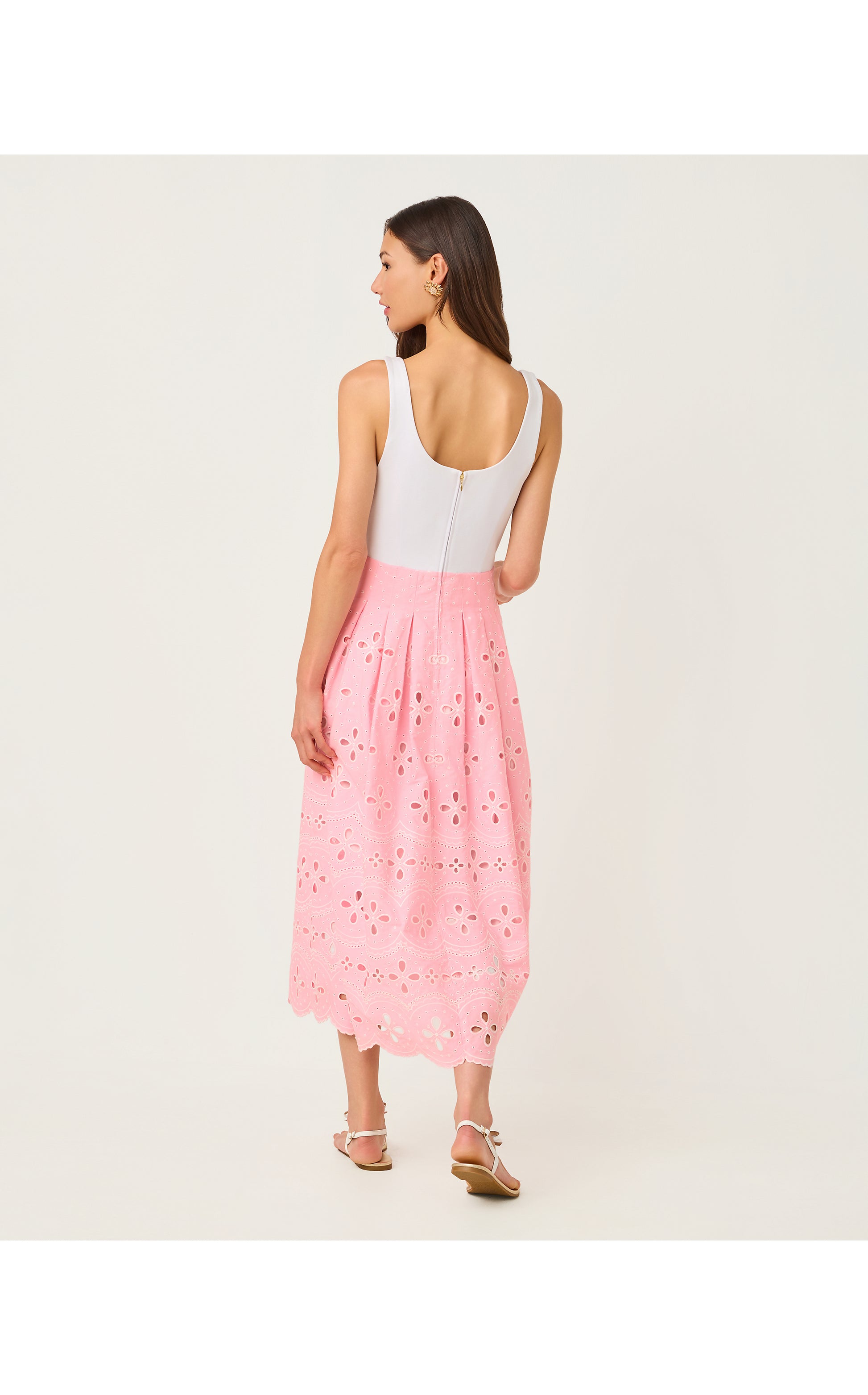 - Fit-and-flare midi dress with a knit tank bodice, an eyelet skirt with a scalloped hem, and side seam pockets.
