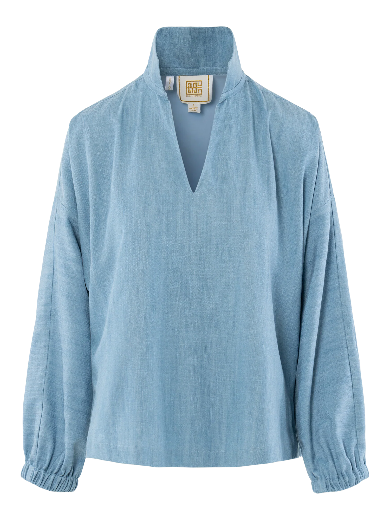Easygoing and endlessly versatile, the Long-sleeve Poppy in Denim Chambray brings a relaxed polish to your everyday wardrobe. Designed with a stand collar, elastic dolman sleeves, and a loose-fitting silhouette, this lightweight chambray offers breathable comfort with a touch of luxe. Style it with crisp white bottoms for a fresh look or create a matching set with the coordinating Tailored Short. A transitional favorite perfect for layering or wearing solo.