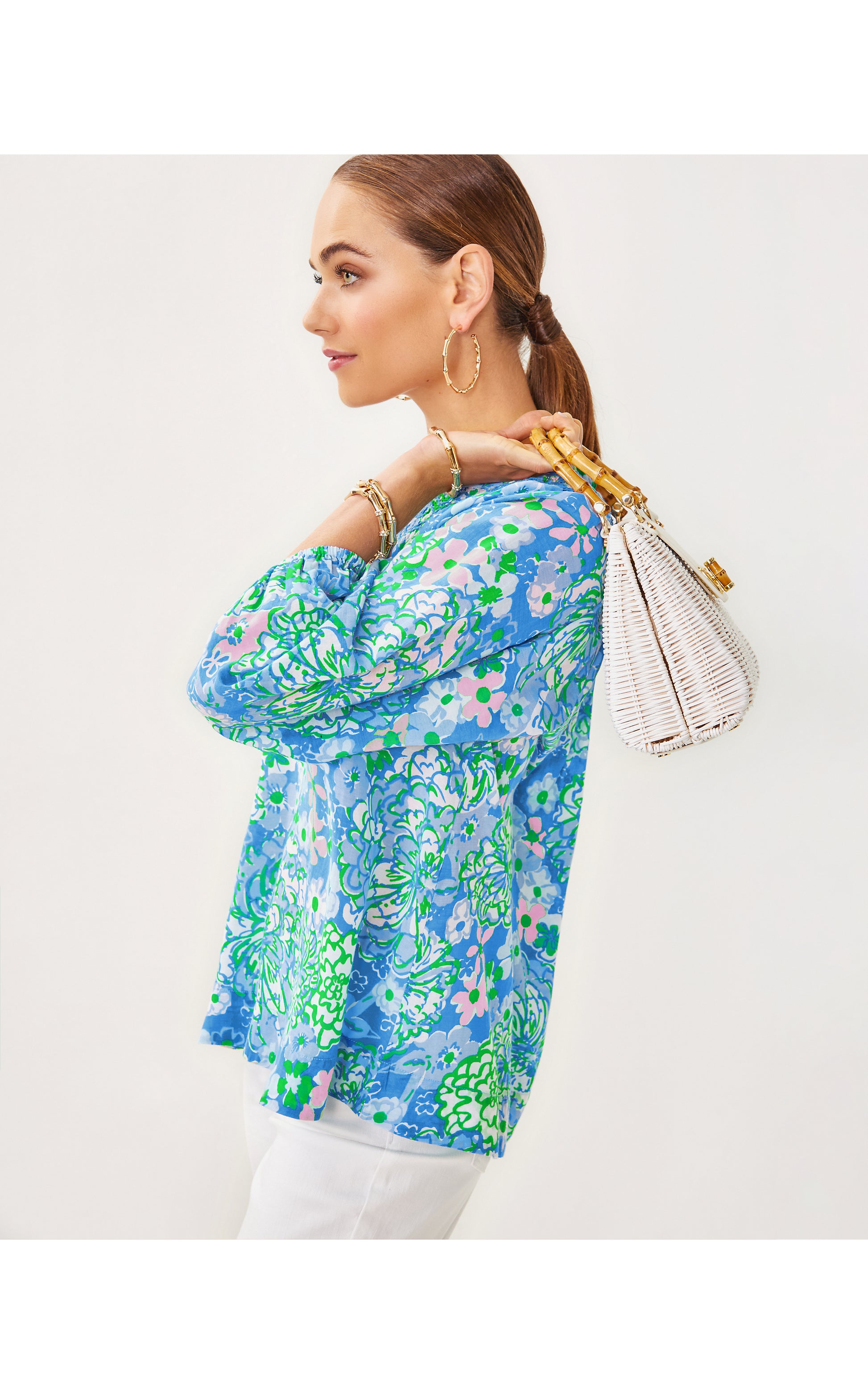 Printed cotton blend fabric and an easy silhouette give the Lourdes Top its airy appeal, while a ruffle collar and full 3/4 sleeves add delightful detail.