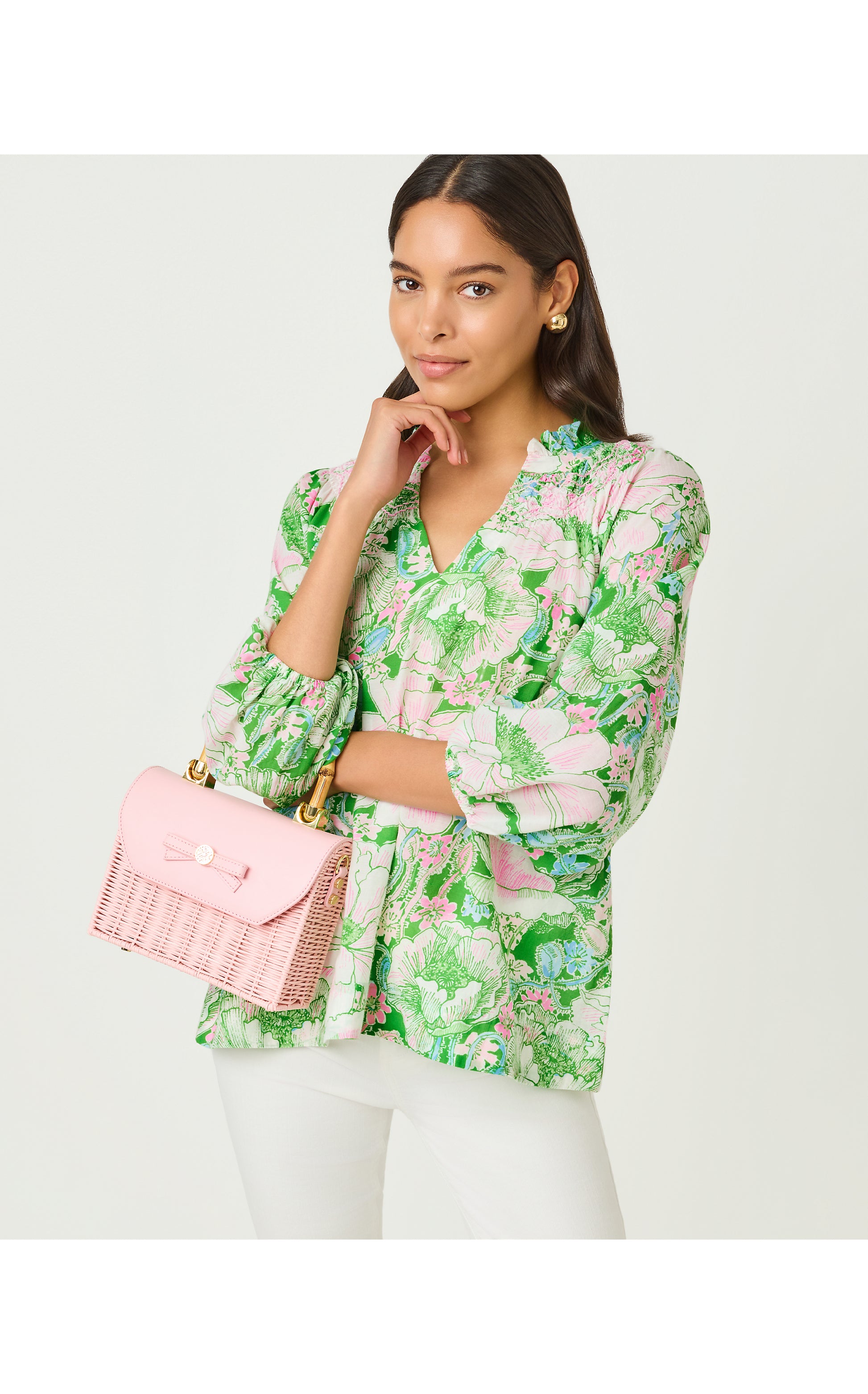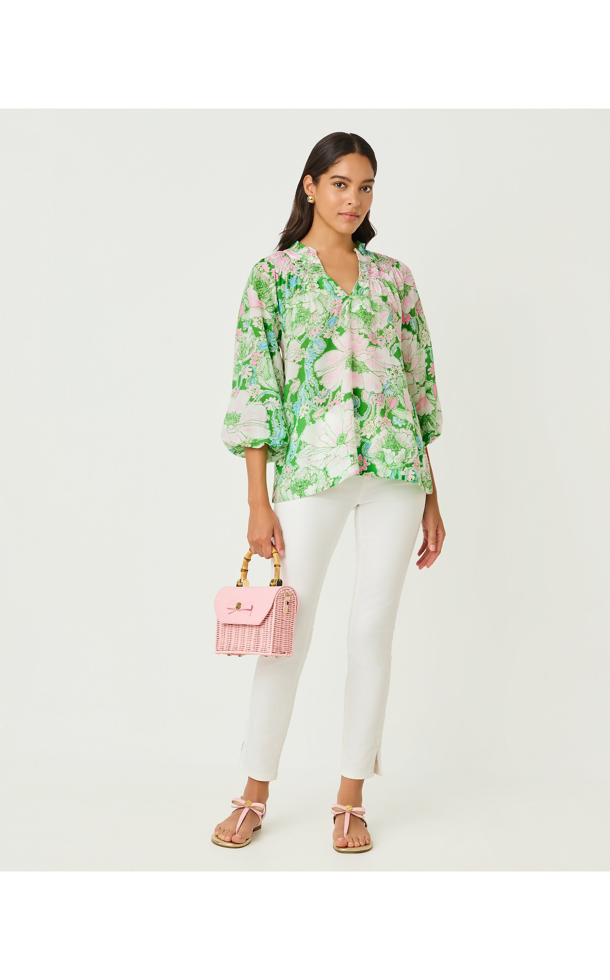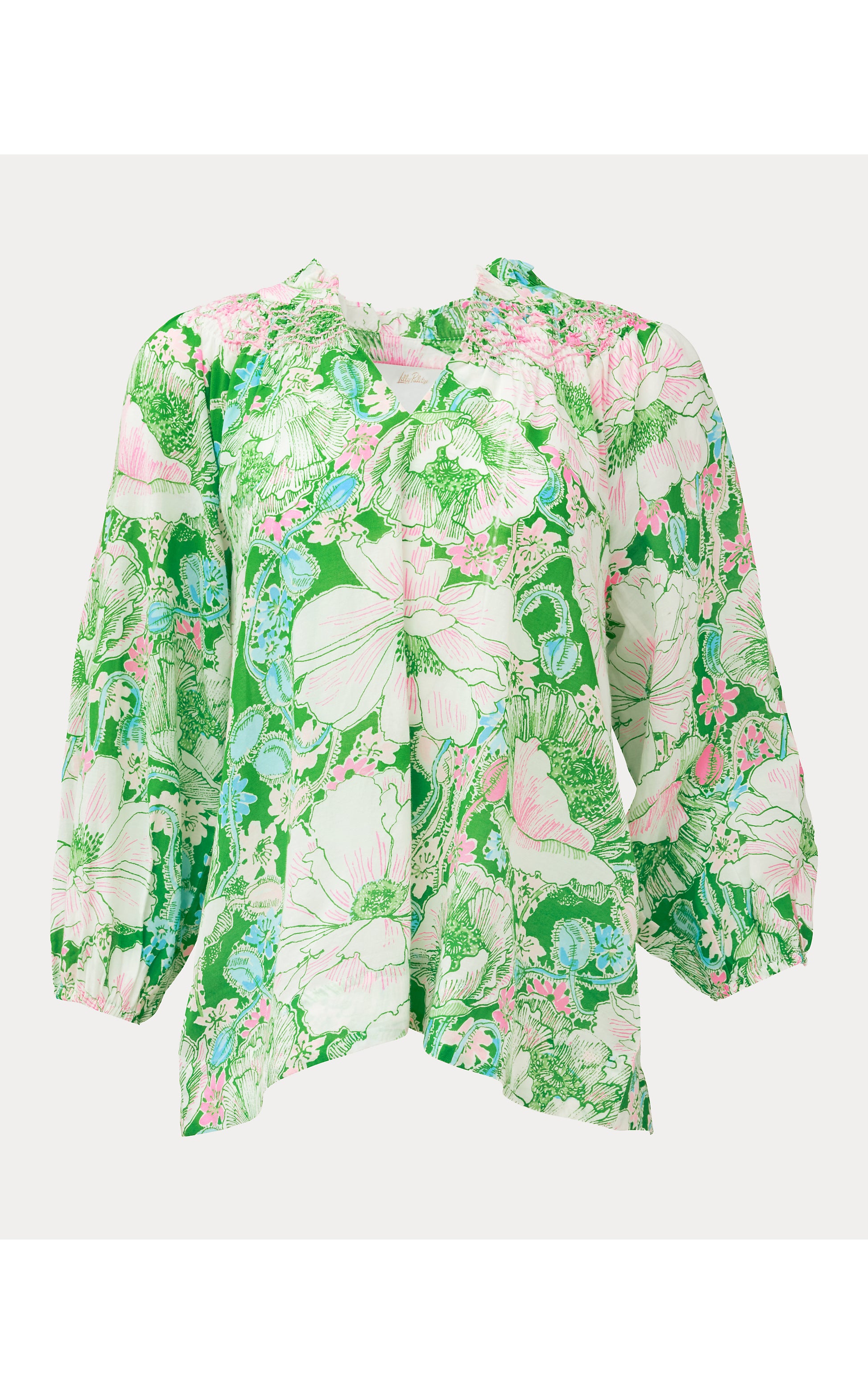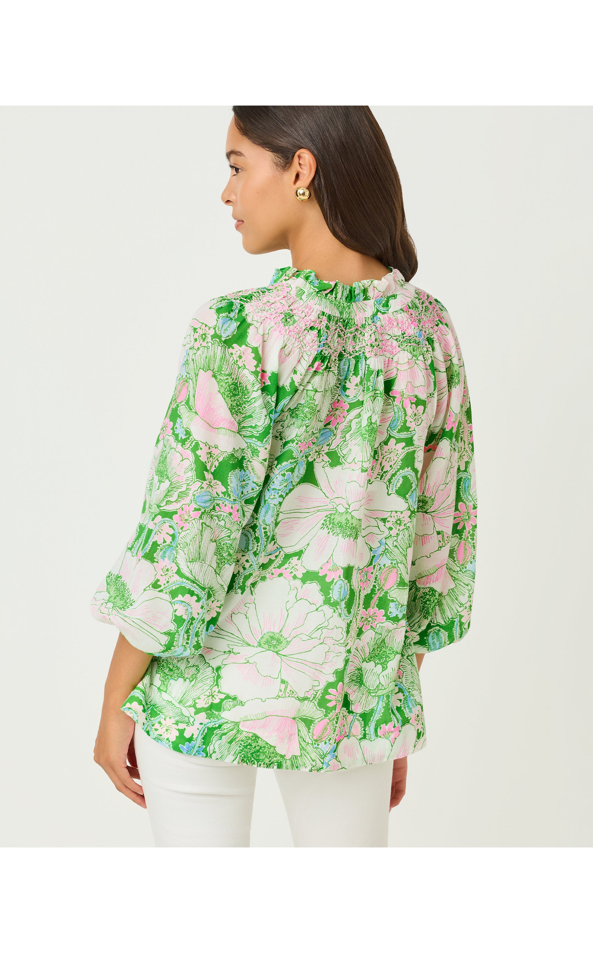 Printed cotton blend fabric and an easy silhouette give the Lourdes Top its airy appeal, while a ruffle collar and full 3/4 sleeves add delightful detail.