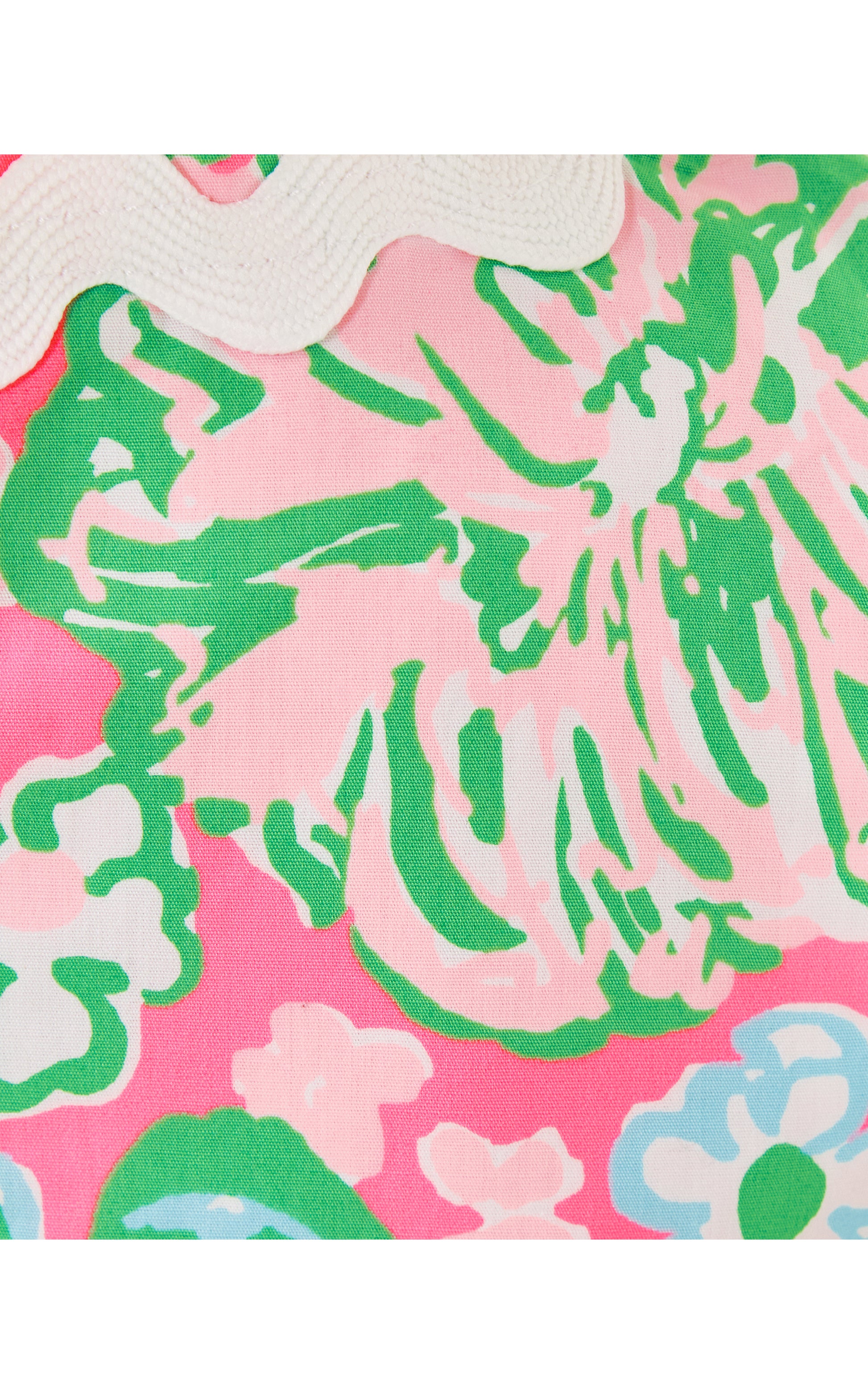 - Shift dress with a notched v-neckline, back zipper, patch pocket details, and ric-rac trim. Includes separate shorts.