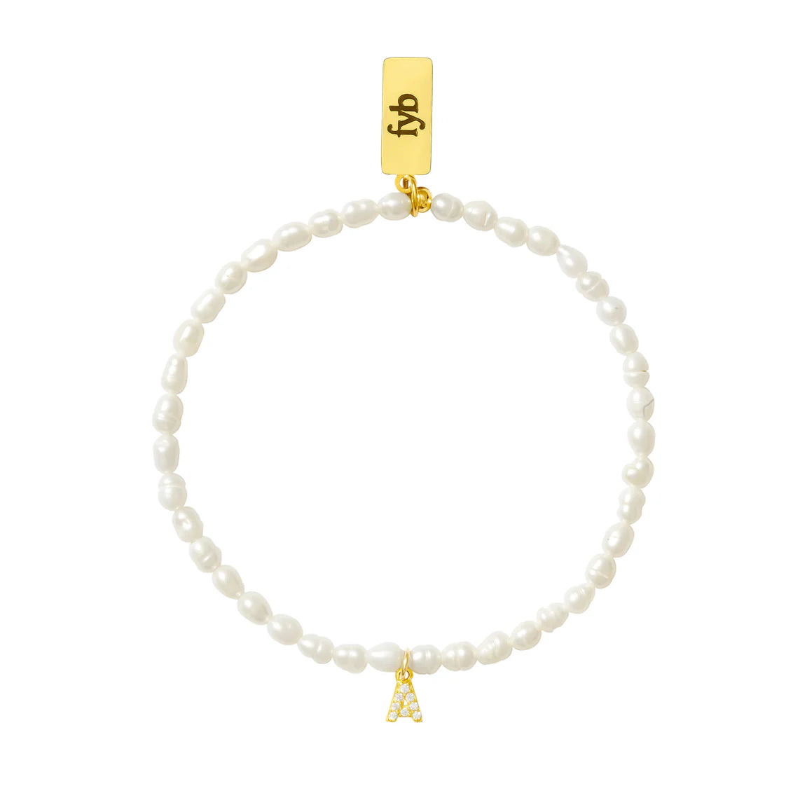 3mm freshwater pearl bracelet, 3A CZ 24k gold plated initial charm, 6.75" stretch to fit. Custom sizing is available upon request.