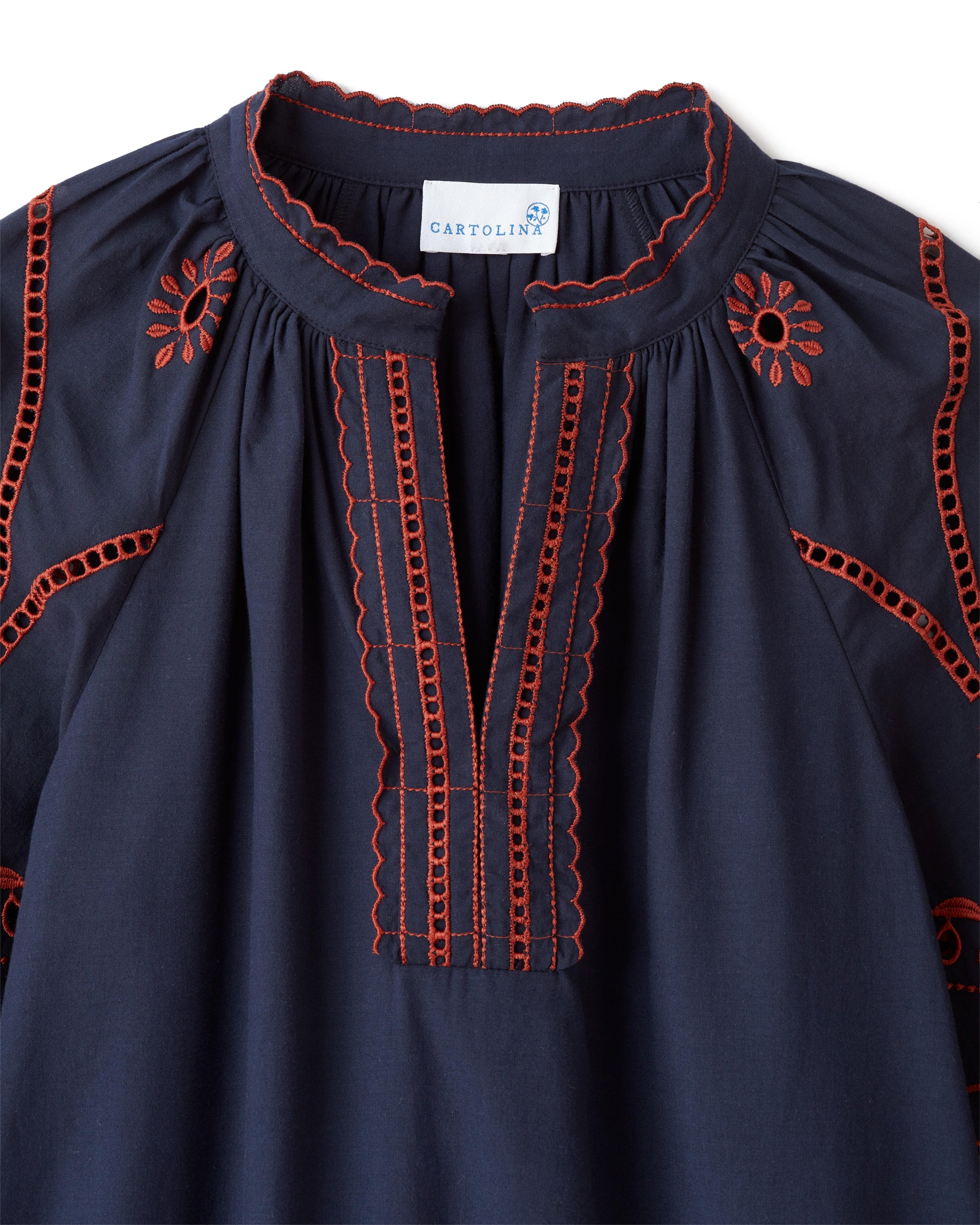 - Raglan sleeve blouse in cotton-blend voile with contrast embroidery
