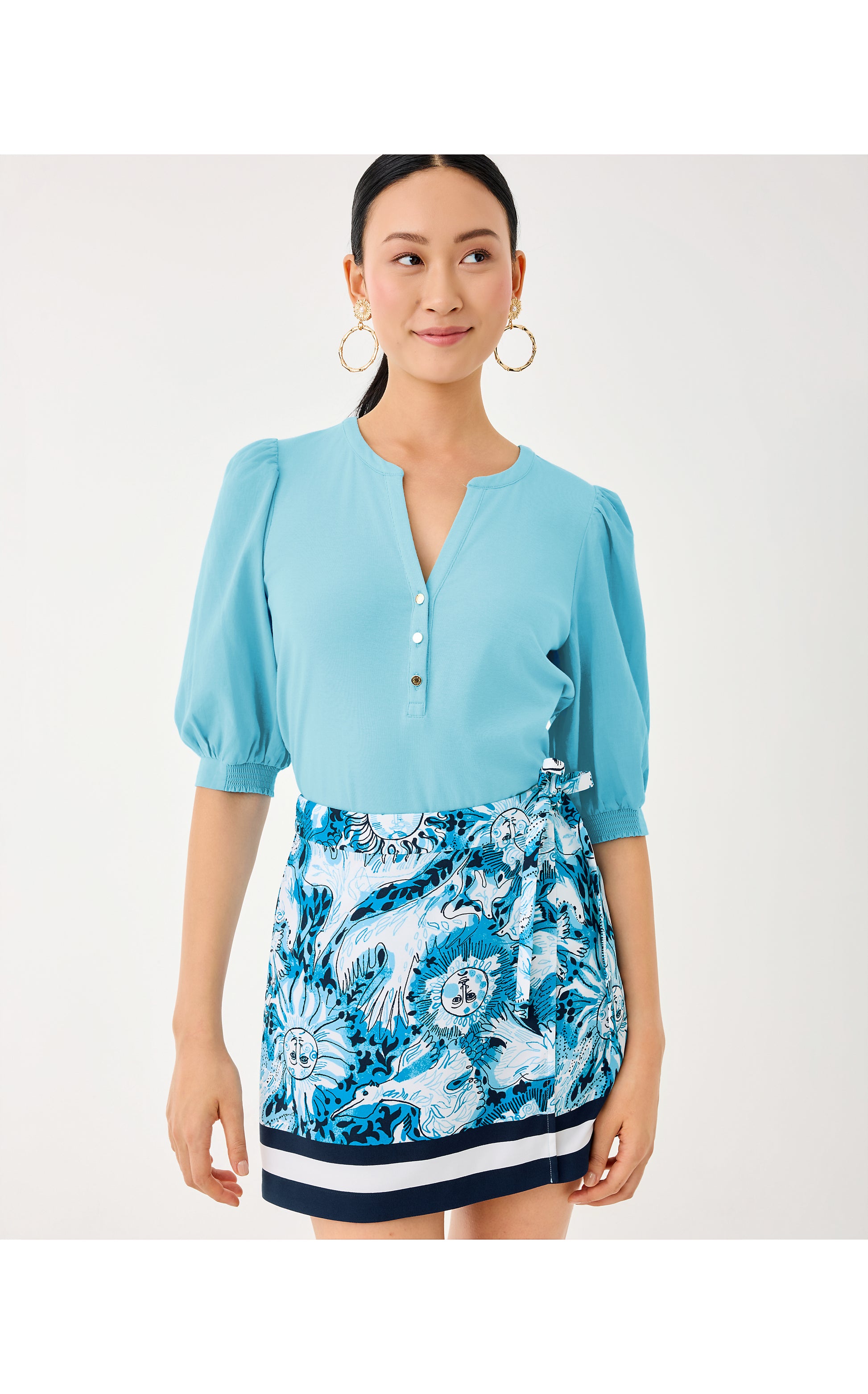 24" Straight Fit Top With Woven Puff Elbow Length Sleeves, Smocked Cuffs, Branded Buttons On Front Placket And Crew Notched Neckline.