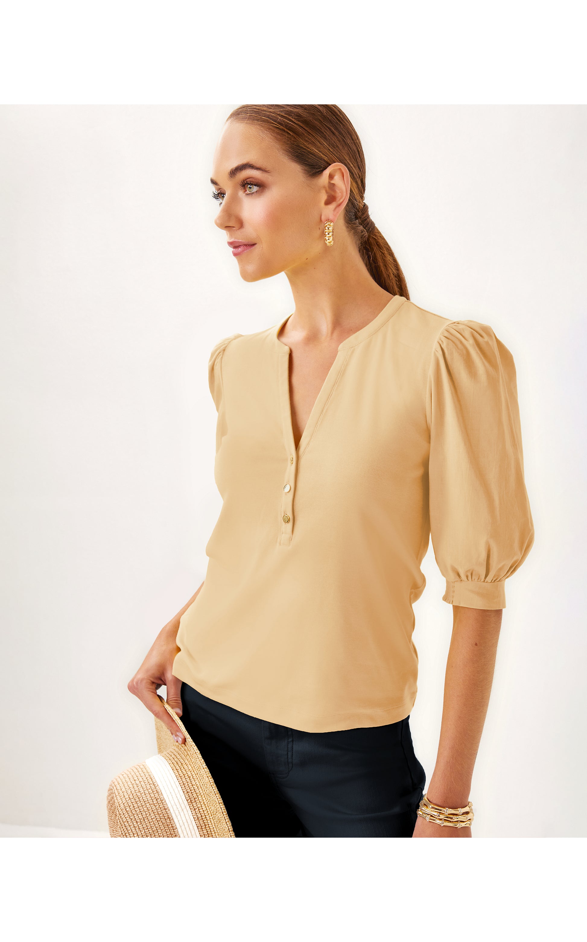 - Straight fit top with puff sleeves, smocked cuffs, buttons, and a crew notched neckline.