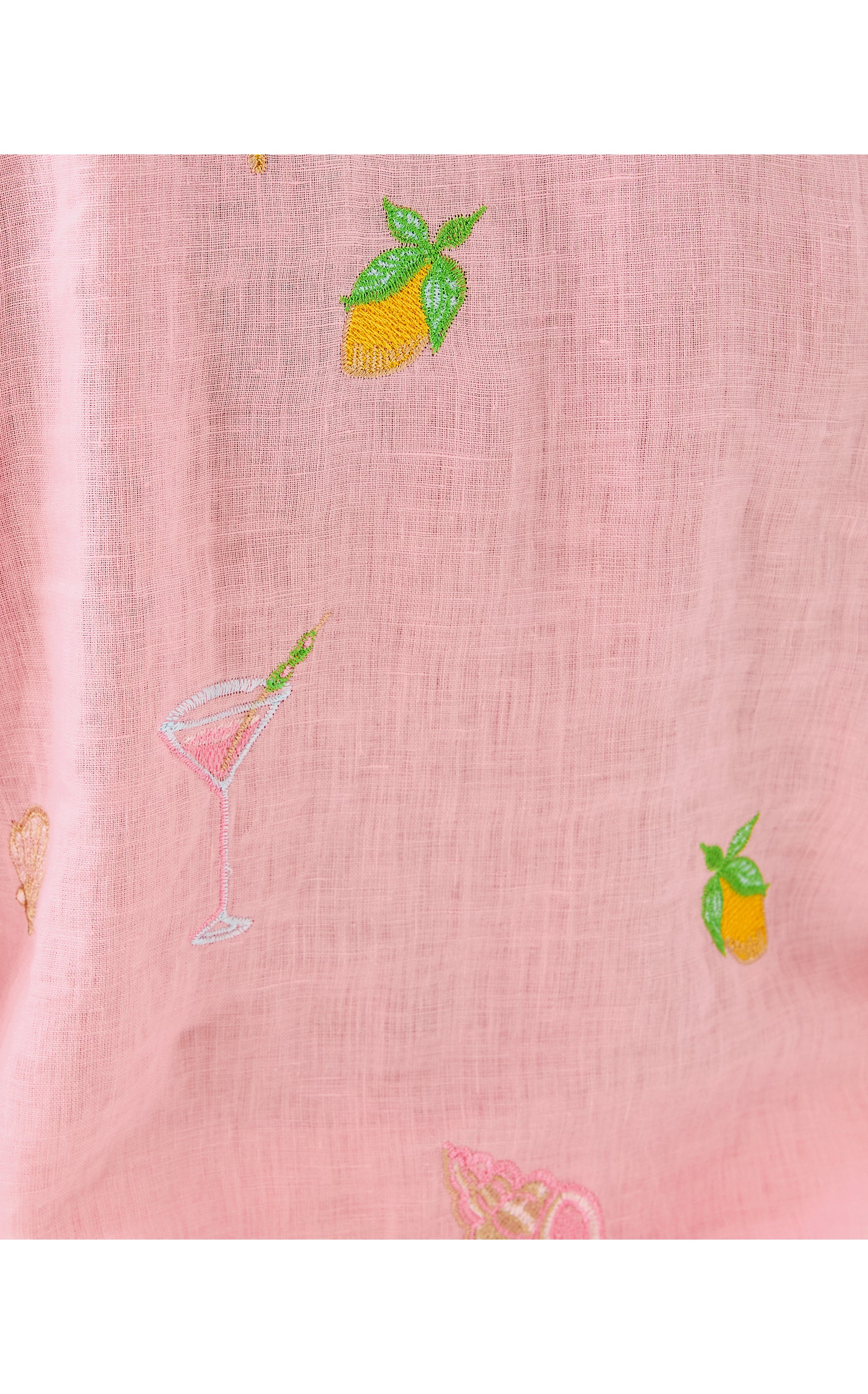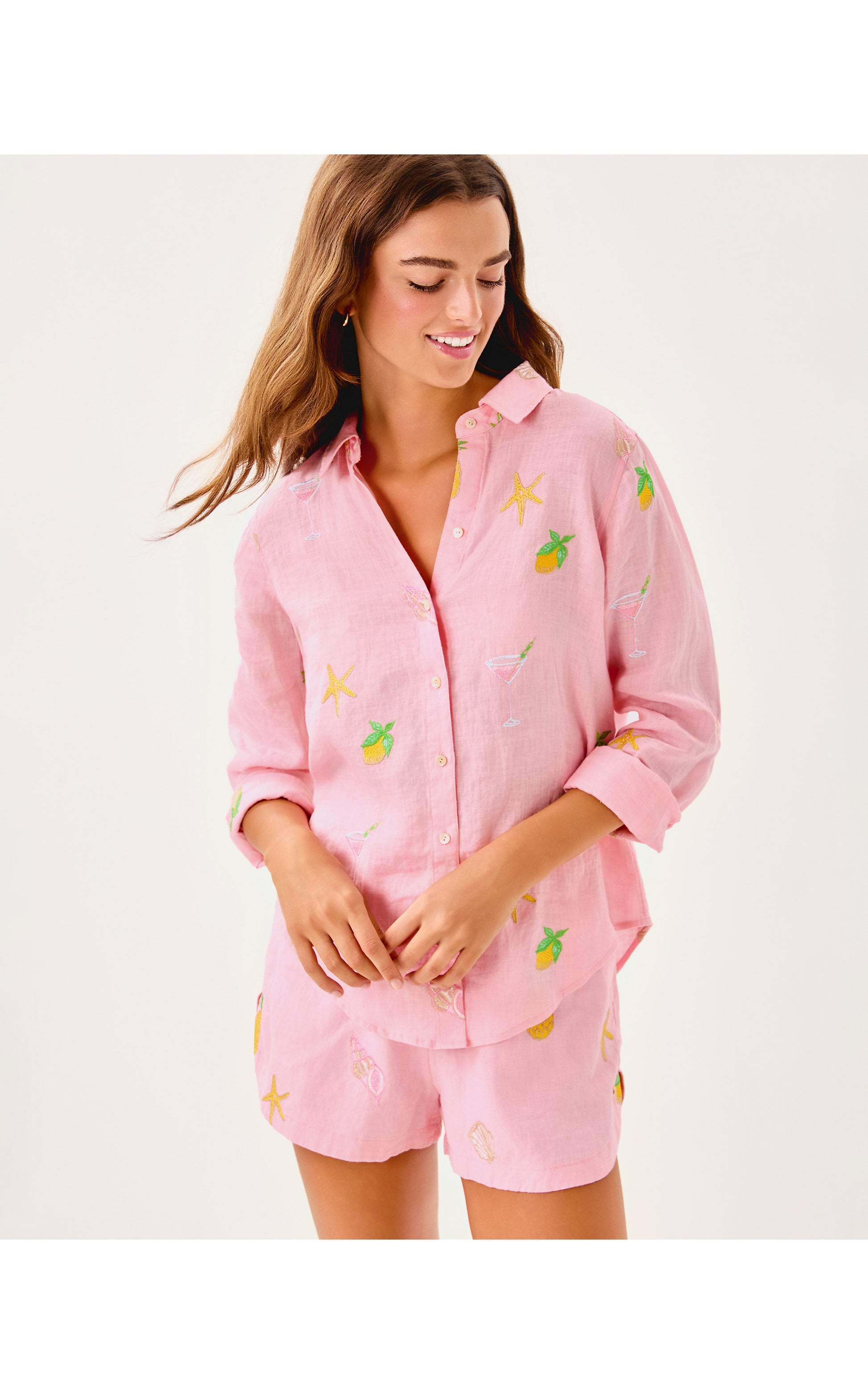 Sea View Button Down - Conch Shell Pink Happy Hour Embroidery