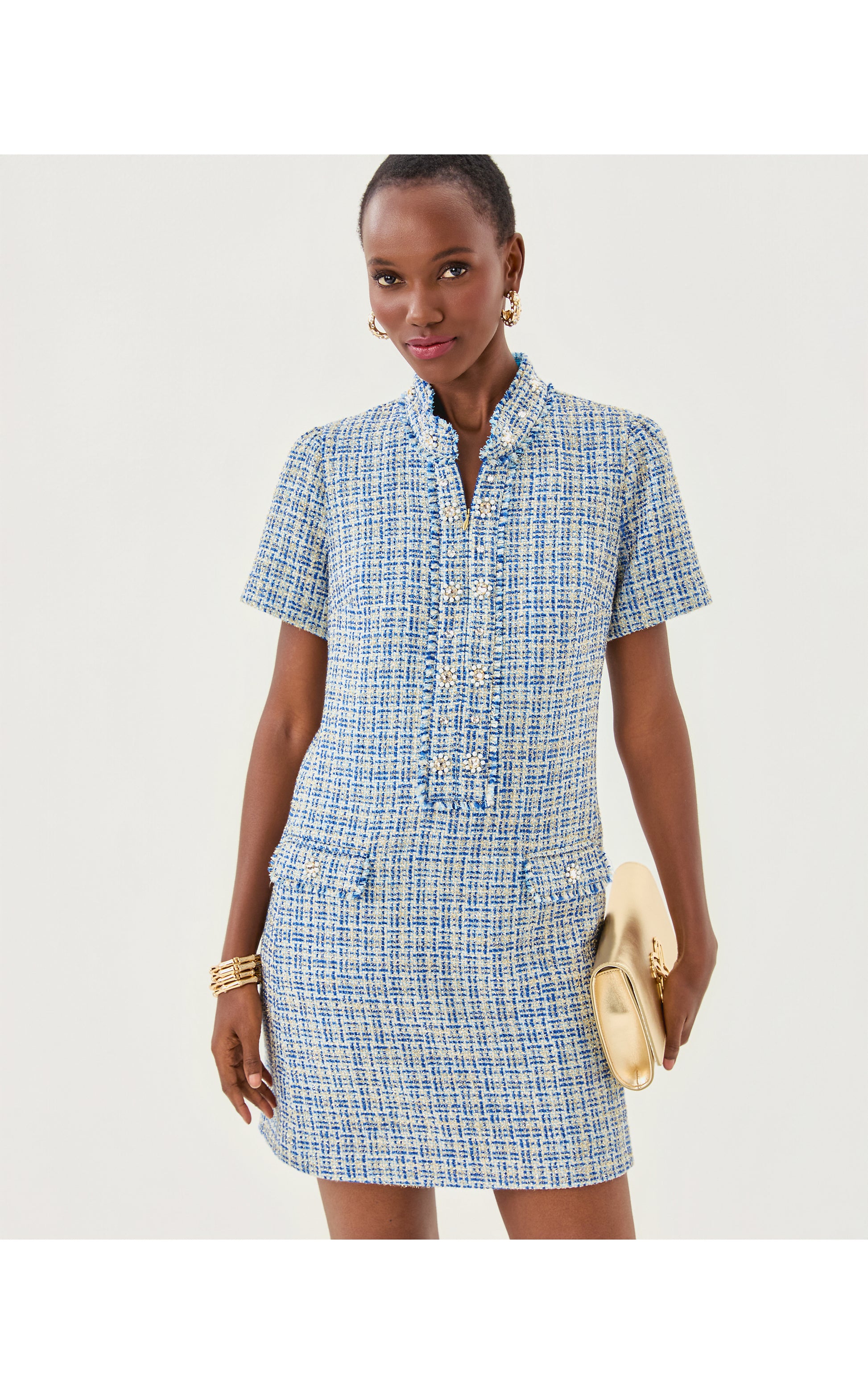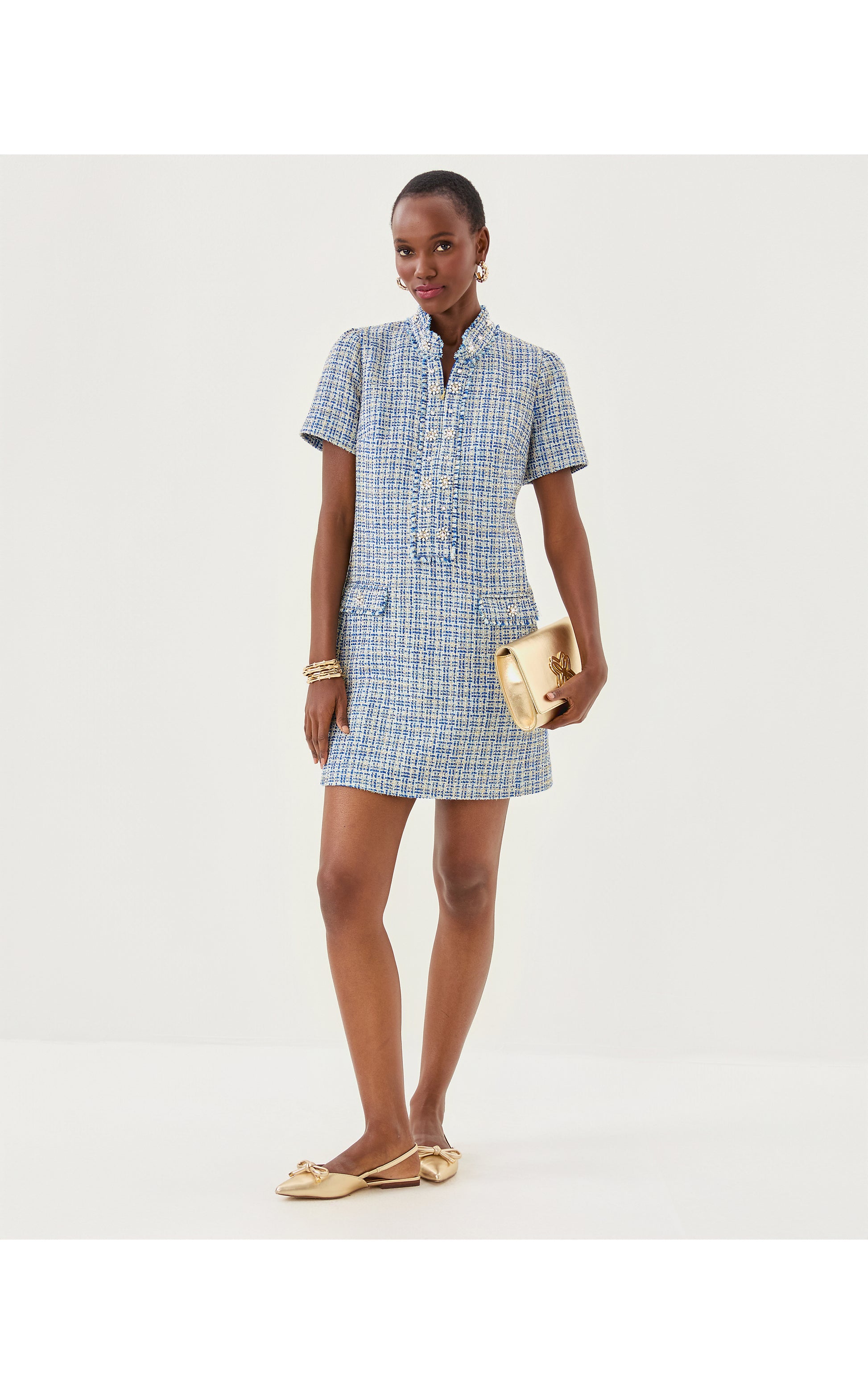 - Straight fit, short sleeve shift dress with a stand collar, flap pockets, and fringe trim with beading.