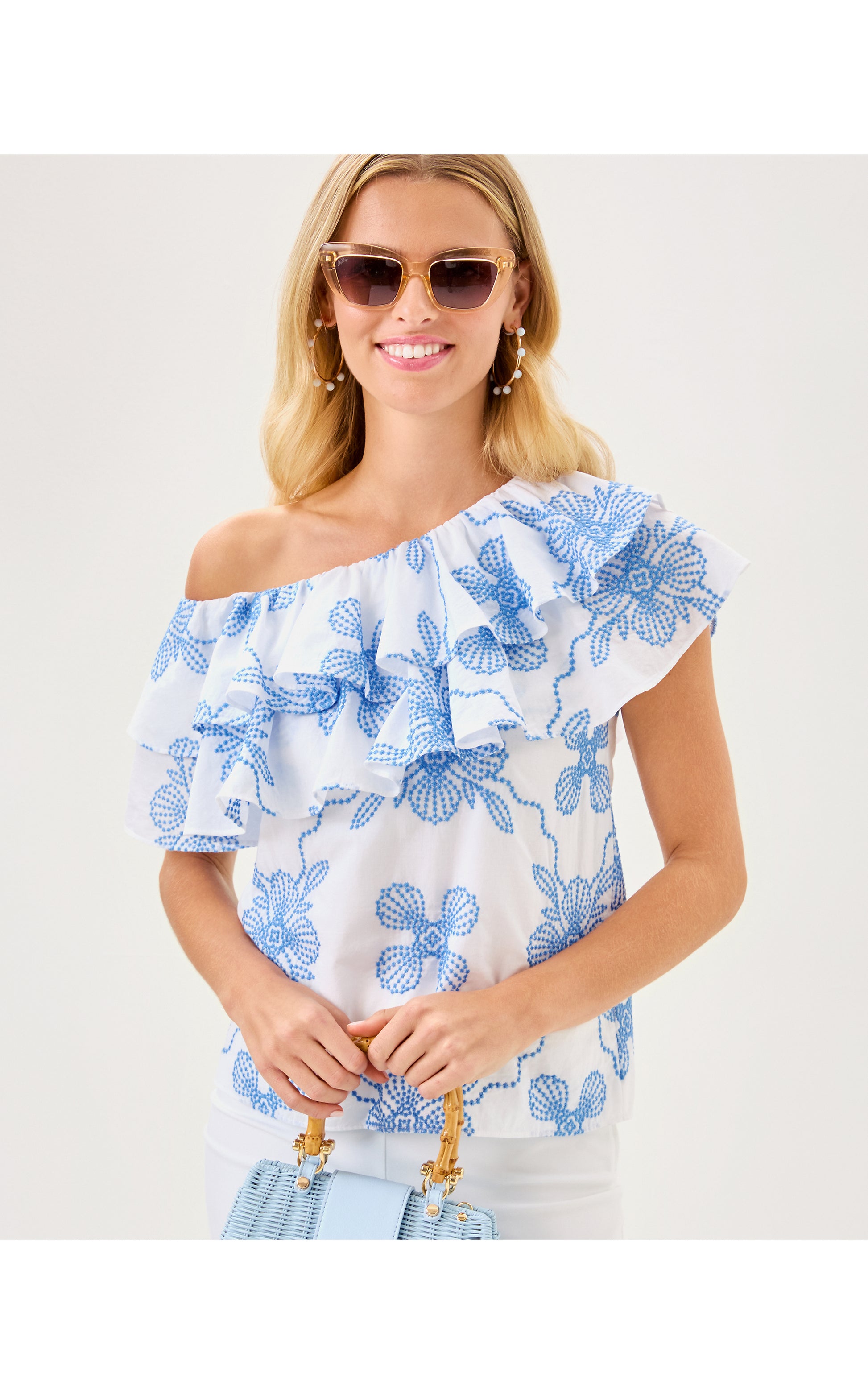 Trixie One Shoulder Ruffle Top - Al Fresco Dot Embroidery