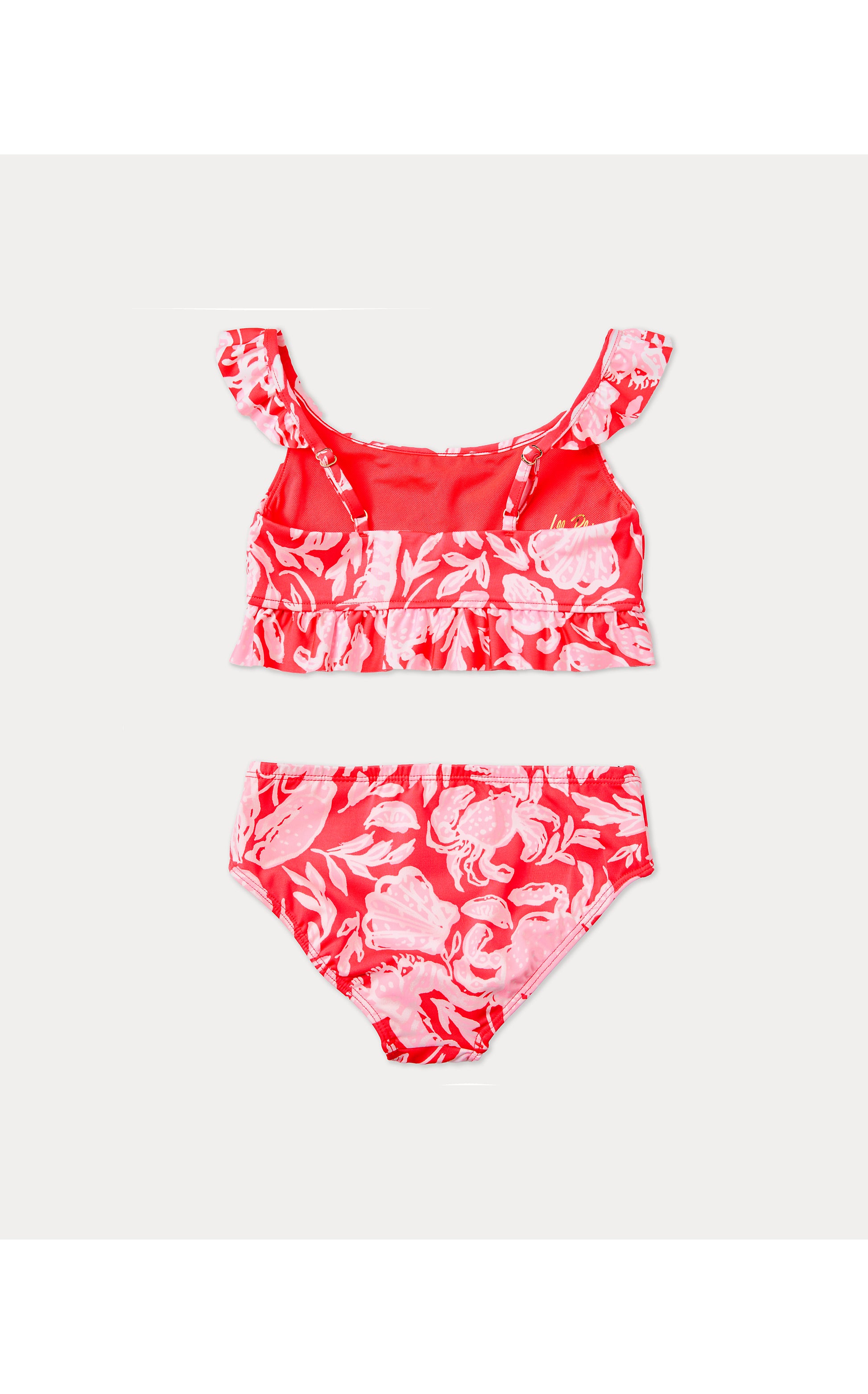 - UPF 50+ peplum tankini top with ruffled adjustable straps, lining, and matching bikini bottoms.