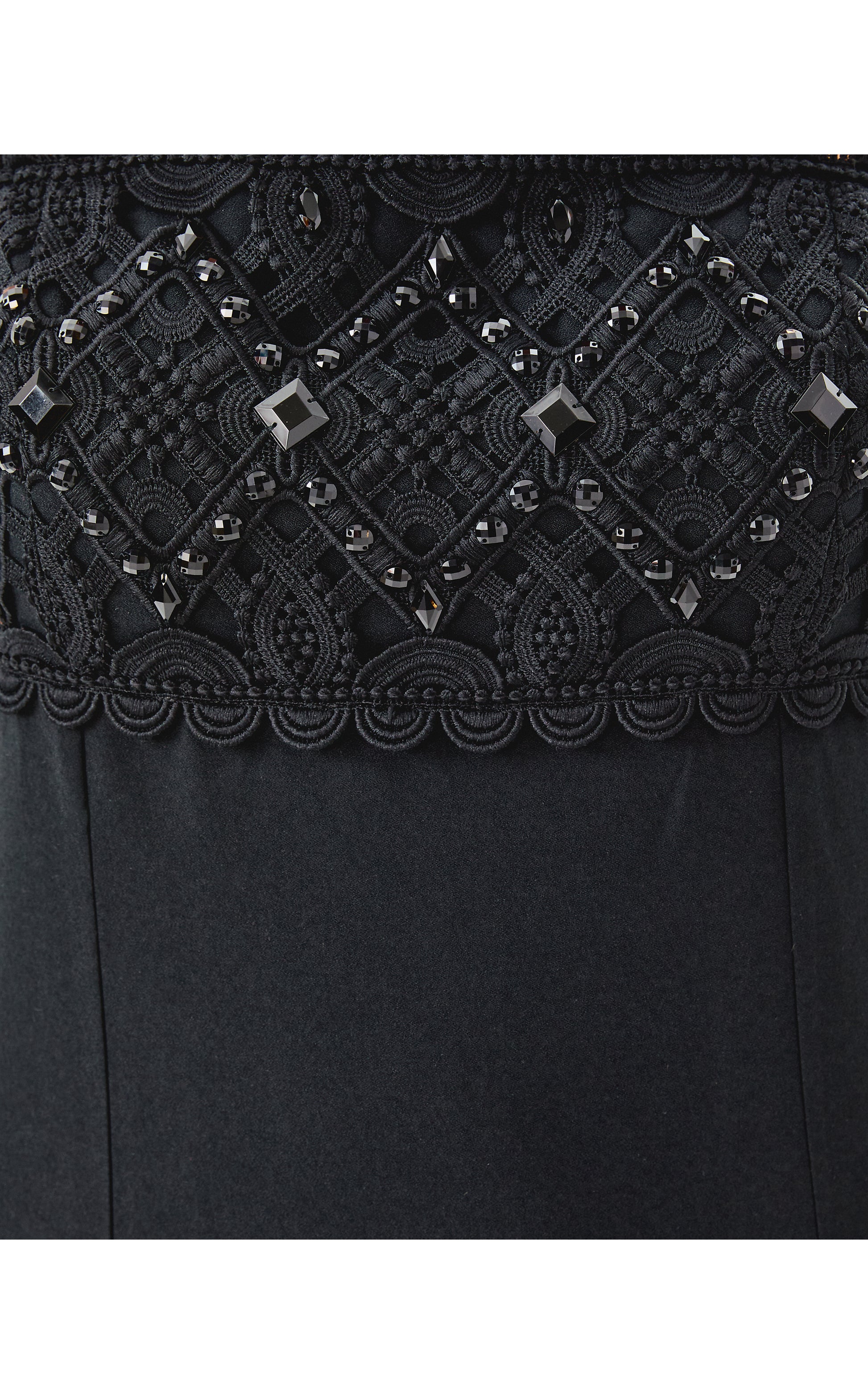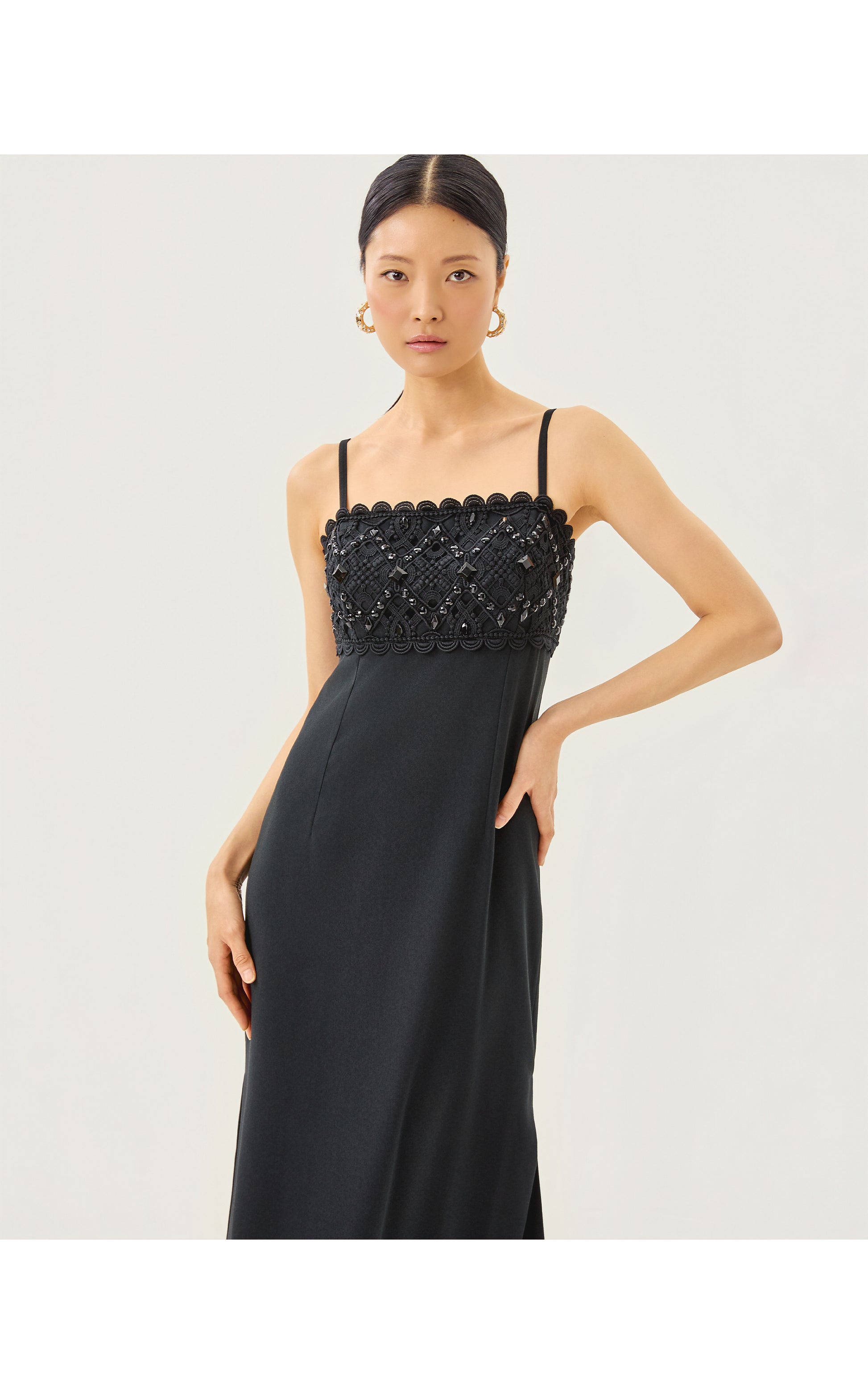 - Fitted, square neck maxi dress with adjustable spaghetti straps, bodice cups, side slits, and wide Lilly lace trim with beading.