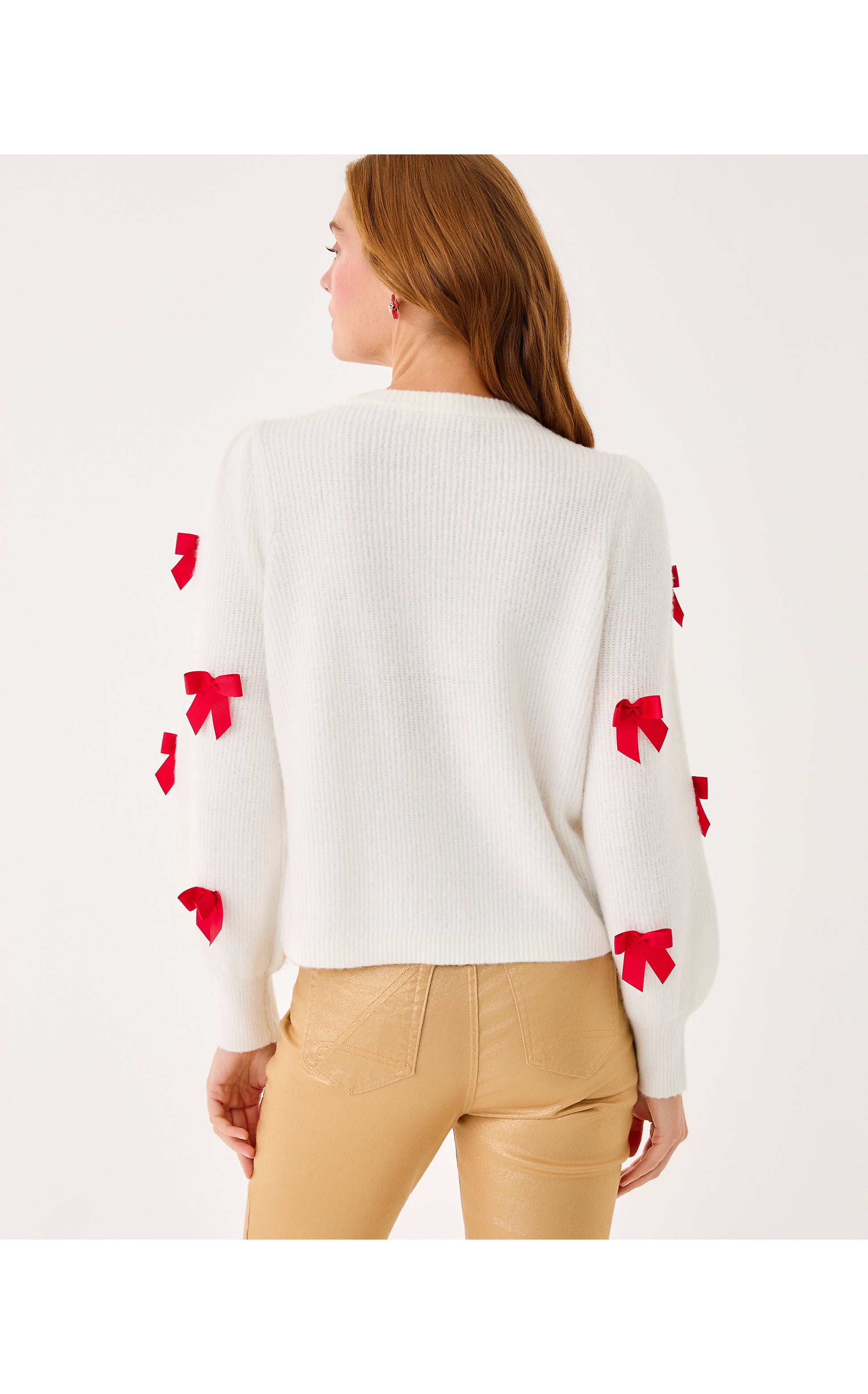 - Straight fit, v-neck cardigan with puff blouson sleeves, buttons, and tossed bow details.